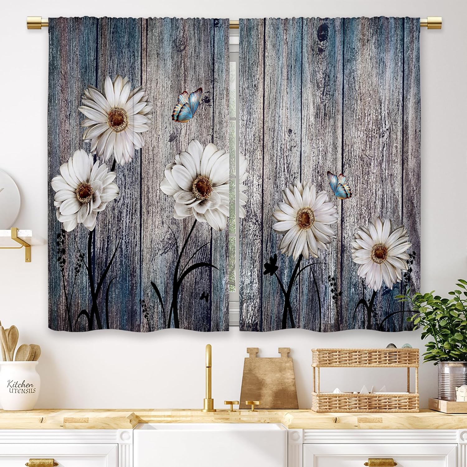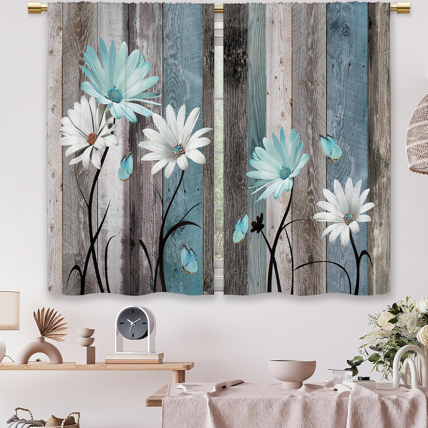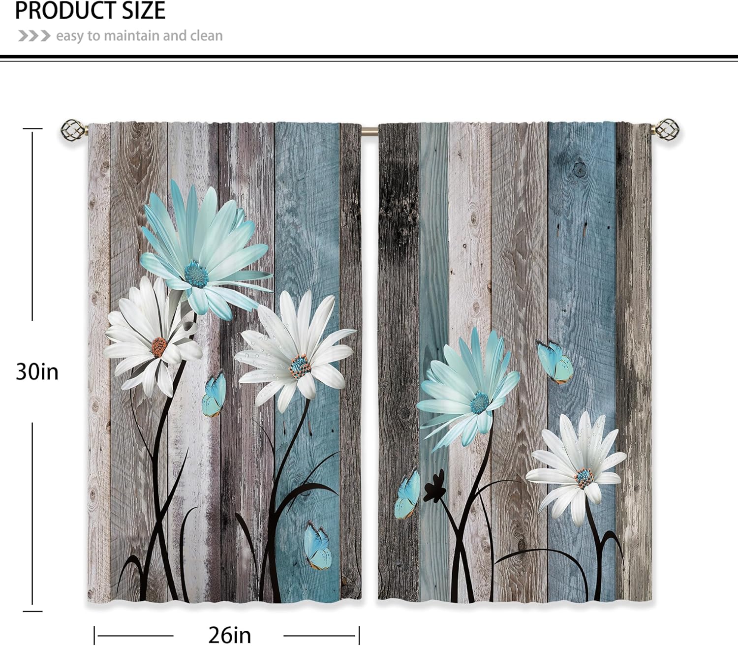 This teal wooden floral kitchen curtains allow appropriate amount of natural lights in, lighten your house and make your room more spacious, but still provide you the necessary privacy. Details: Material: 100% polyester fabric Pattern: floral wooden Size: 26 inches width x 30 inches length What’s included: 2 panels curtains Washing Tips: 1.Machine washable 2.Wash cold by gentle cycle 3.Mild detergent needs to be used 4.Do not bleach If you have any problem, feel free to let us know, we will give you the most satisfactory solution.