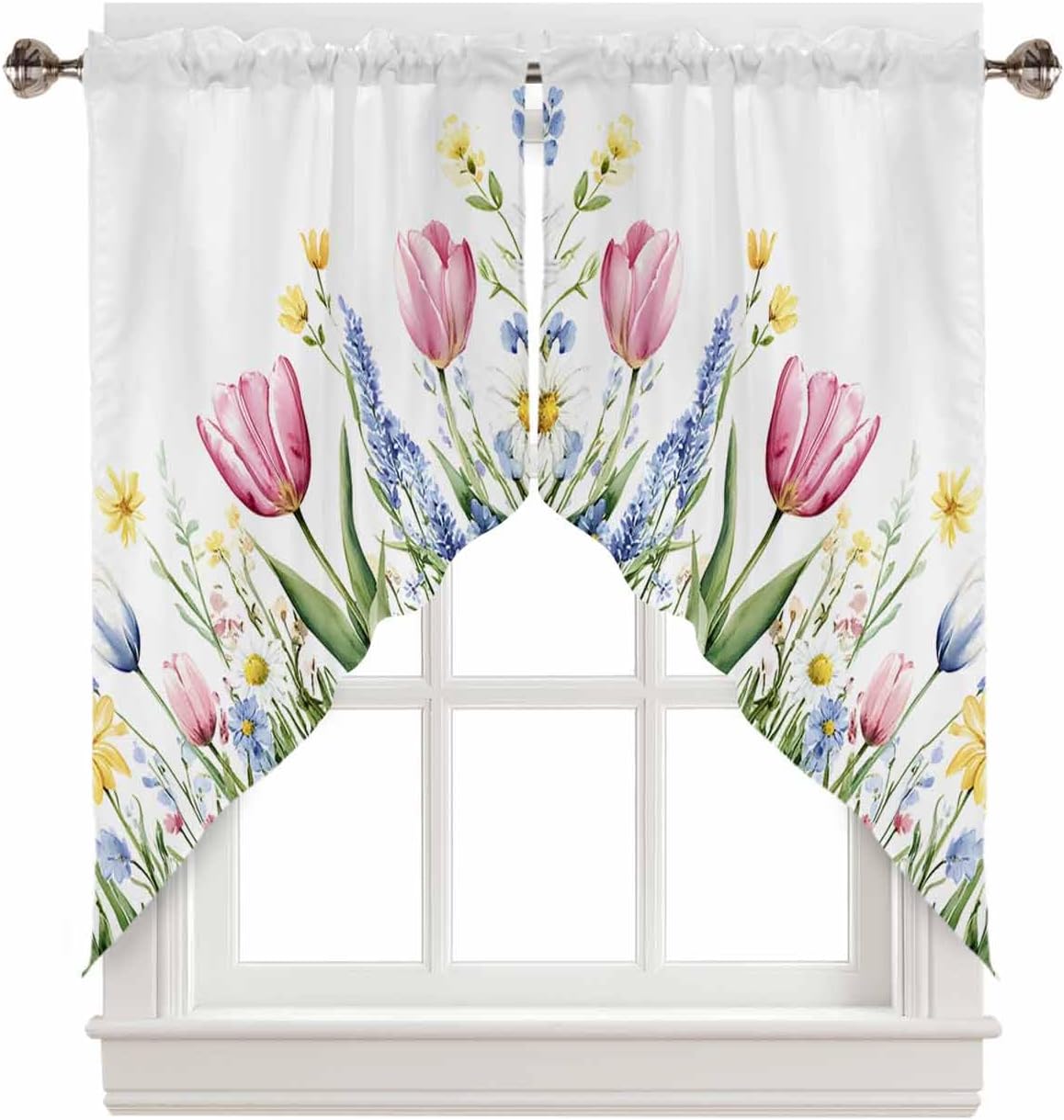 Spring Rustic Pastoral Floral Light Filtering Swag Valances for Kitchen Bedroom Living Room 3 KINDS OF SIZES YOU CAN CHOOSE: 2 panel swag valances 28"W x 36"L 2 panel swag valances 36"W x 36"L 2 panel swag valances 36"W x 45"L EASY TO INSTALL AND REMOVE: The rod pocket for the light filtering valance fits most straight rods on the market(less than 2 inches in diameter. You just need to easily hang our curtains onto the rod LIGHT FILTERING AND PRIVACY PROTECTION: Light filtering curtains prevent sunlight from entering the room directly, protecting your furniture and floor from strong light and keeping your privacy EXQUISITE DECORATION: Printed with colored flower, butterflies and greenn plants, this kitchen valances bring elegance to your home, so you can hang our curtains wherever you want to decorate WIDE USAGE: As a household item, our swag valances are suitable for kitchen, bathrooms, bedrooms, living rooms and so on. And they can also be given as a present to your friends EASY TO CLEAN AND CARE: Our swag valances can be easily cared by machine washing in cold water. Do not bleach and do tumble dry with low heat