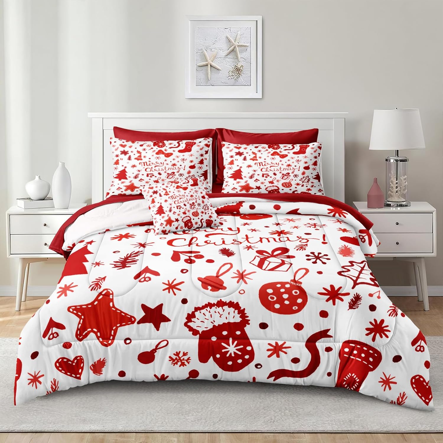 Merry Christmas Bed in A Bag Package Includes: 1 Xmas Comforter 2 Christmas Pillowcases(Tips: twin bed set has only one)2 Solid Pillowcases(Tips: twin bed set has only one)1 Flat Sheet1 Fitted Sheet1 Cushion CoverSize InformationTwin Size- 1 Comforter: 66"x90"; 2 Standard Pillowcases: 20"x30"; 1 Flat Sheet: 66"x96"; 1 Fitted Sheet: 39"X 75"; 1 Decor Pillow Cover: 18"x18"Full Size- 1 Comforter: 80"x90"; 4 Standard Pillowcases: 20"x30"; 1 Flat sheet: 81"x96"; 1 Fitted Sheet: 54"x75"; 1 Decor Pillow Cover: 18"x18"Queen Size- 1 Comforter: 90"x90";4 Standard Pillowcases: 20"x30"; 1 Flat Seet: 90"x102"; 1 Fitted Sheet: 60"x80"; 1 Decor Pillow Cover: 18"x18"King Size- 1 Comforter:104"x90"; 4 King Pillowcases: 20"x36"; 1 Flat Sheet: 108"x102"; 1 Fitted Sheet: 78"x80"; 1 Decor Pillow Cover: 18"x18"Warm TipsBed Comforter Set is packed in a a vacuum bag and maybe a little shriveled and wrinkled when you received it. it is recommended that you hang it in the sun and gently pat a few times to make it fluffy. Guarantee 100% satisfaction with 30 night trial, return for full refund if you don’t entirely love.