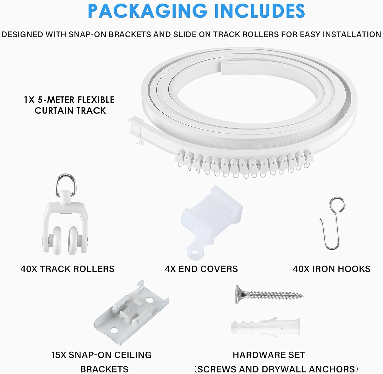 SpecificationMaterial: PVC and steelLength: 16.4ftColor: whitePackage IncludesCurtain Track: 16.4ft Rollers: 40pcsCeiling Mounting Brackets: 15pcsEnd Caps: 4pcscurtain clips: 40pcsScrews and Anchors: 30 setsHow To Use1. Find the drill spots on the ceiling, the distance between any two spots should be between 10-12 inches.2. Fix the ceiling mounting brackets on the drilling spots with screws. All lockable ceiling mounting brackets must be facing the same direction3. Straighten the curtain track ,you can wind the track up and tie it in reverse. (you need be cautious as to not reverse bend too much or it will crease).4. Install rollers, hooks and end caps on the curtain track. (The track is i-shaped, with flat side up and curved side down. flat side used for mounting brackets and curved side used for rollers).5. Clip the installed curtain track to the ceiling mounting brackets.