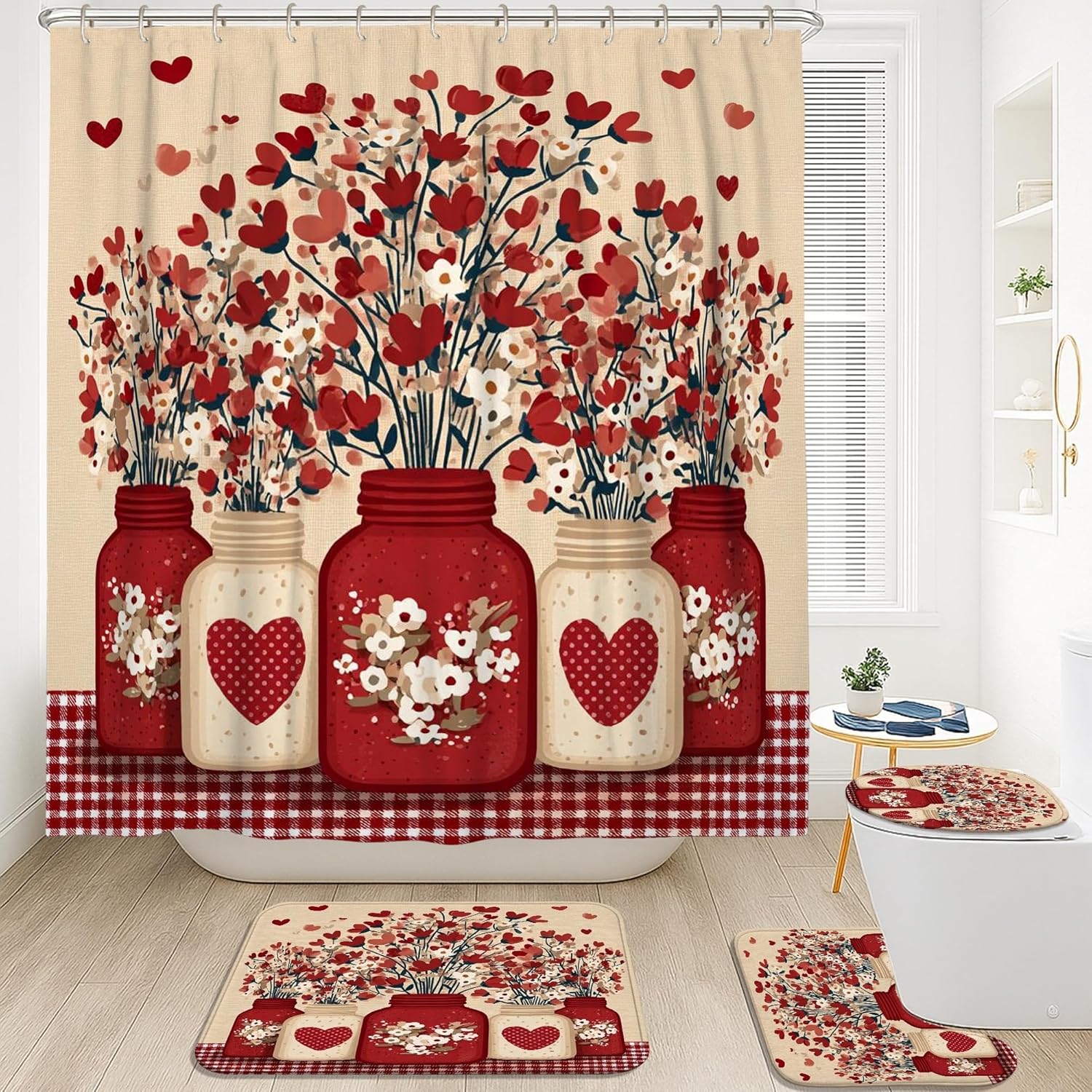 Transform your bathroom into a cozy retreat with this rustic shower curtain featuring charming jars filled with vibrant flowers and hearts. The warm color palette of red and beige creates an inviting atmosphere, perfect for enhancing your home decor. Easily maintain this polyester curtain, ensuring it remains a beautiful centerpiece in space. Ideal for adding touch of seasonal flair, is both functional decorative.