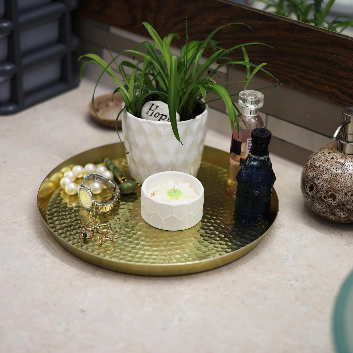 Sharaar Round metal serving tray, handmade in India, features a raised edge and hammered finish, perfect for serving or decorating. Its color adds a touch of elegance to any place, making it perfect for home decor or serving. A practical yet decorative retro-style tray, ideal for gifting on Valentine's Day, anniversaries, birthdays, Christmas, Mother's Day, or weddings.