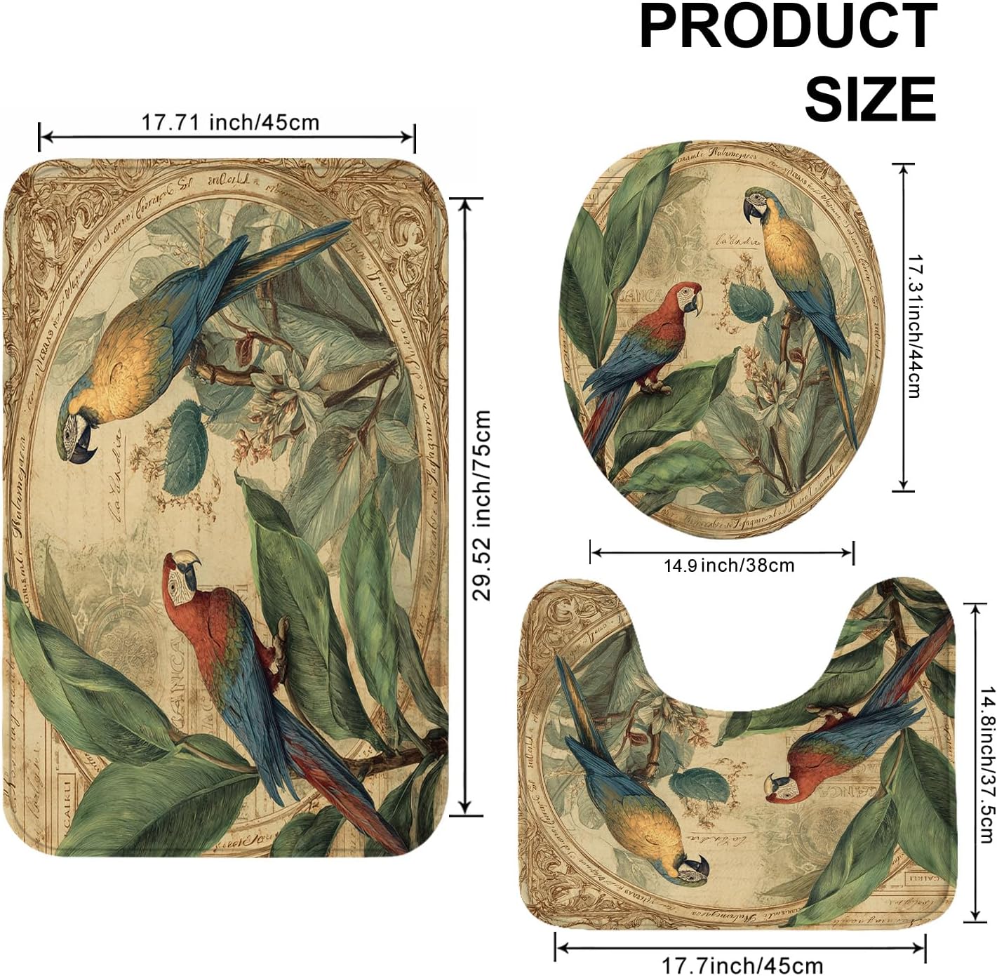Tropical Bathroom Mat Sets 3 Piece, Antique Parrots Leaves Absorbent Non Slip Toilet Rugs U Shaped Washable, Summer Botanical Quick Dry Memory Foam Bathroom Rug Set