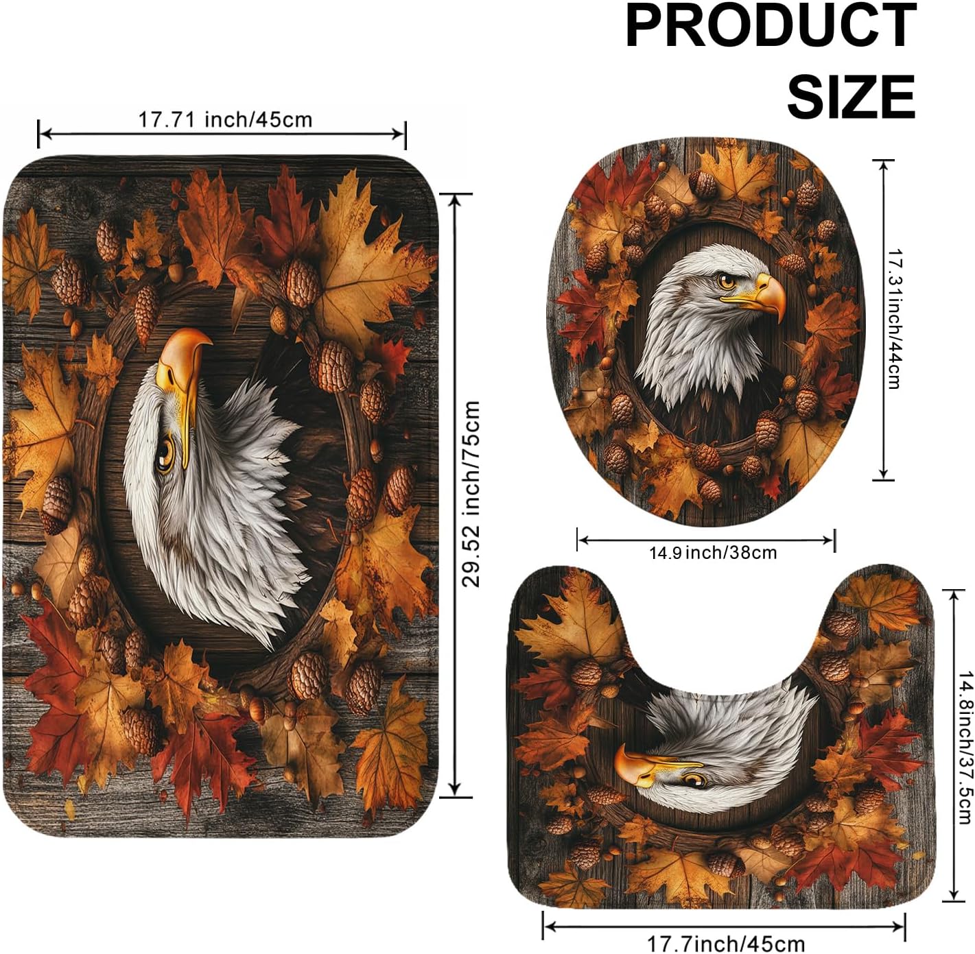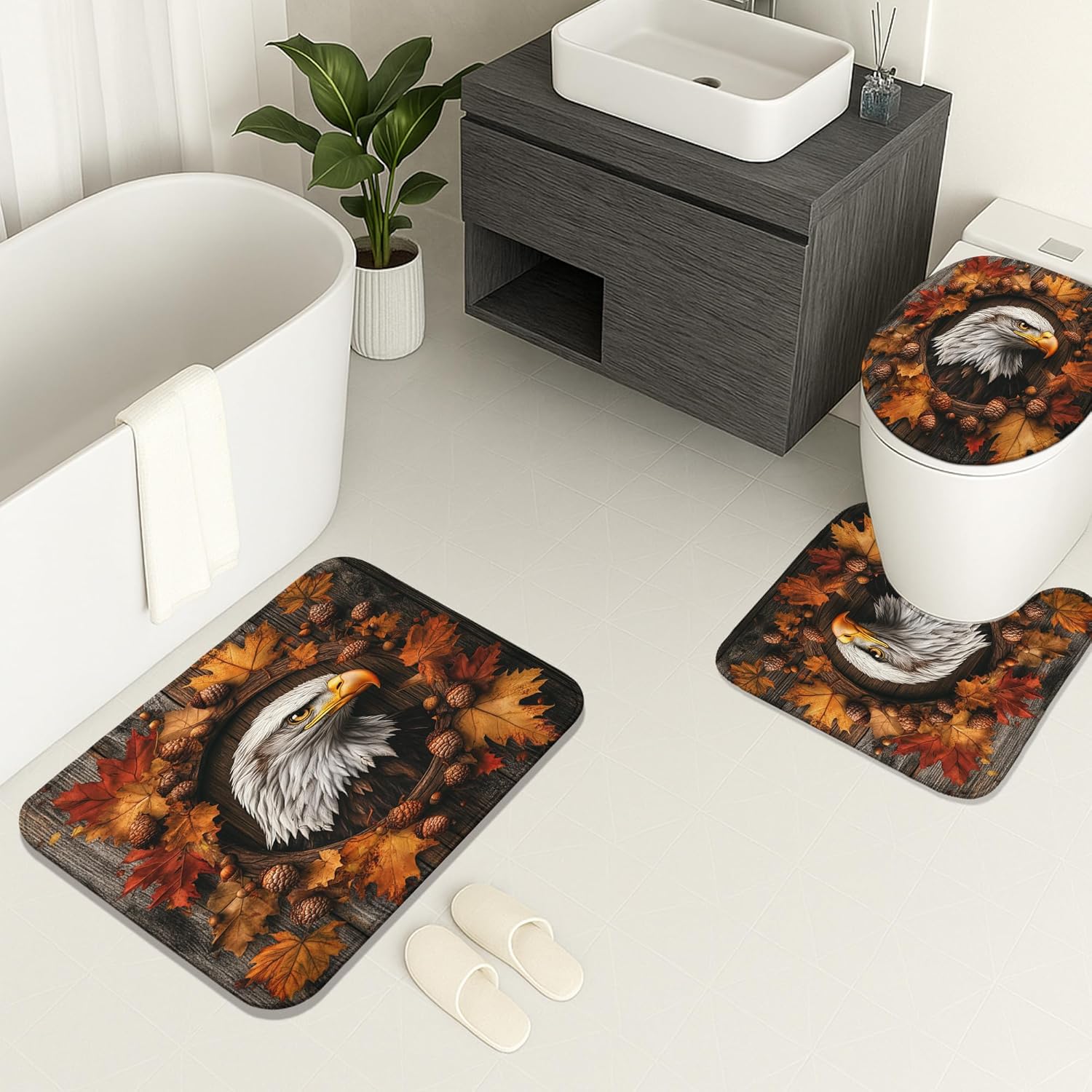 Eagle Bathroom Mat Sets 3 Piece, Autumn Wildlife Rustic Leaves Non Slip Toilet Rugs U Shaped Washable, Nature Themed Quick Dry Memory Foam Bathroom Rug Set