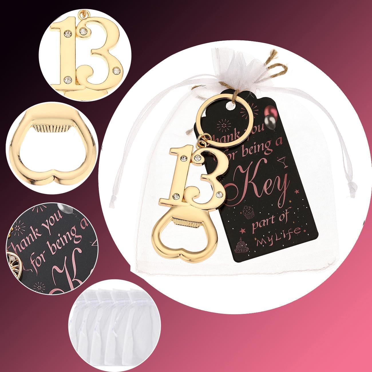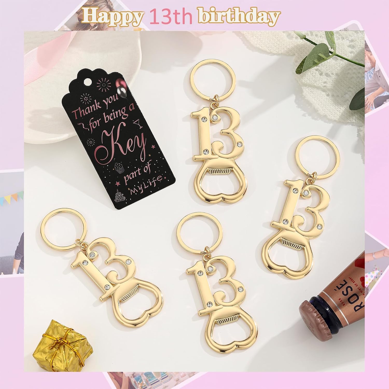 【DIY Thinking 】: The 13th birthday party gift set can fully express your blessings, with a blank design on the back of the card. You can stick stickers on the card or write down what you want to say to friends and guests; Guests who receive DIY gifts will definitely feel your warmth, and your guests will never forget this day. 13th Beer Bottle Openers for 13th Birthday Party Favors or 13th Wedding Anniversary Bottle Openers Souvenirs Decoration for Guests Material:Zinc Alloy Color: Gold Gift Bag Size: 4.0 x 6.0 inches Bottle Opener Size: 3.9 x 1.5 x 0.12 inches Tag Cards Color:Craft Paper. Escort Cards Size: 3.5*2.0inch Package Included: 12 pcs party favors bottle opener Chic design: the 13th bottle opener adopts a golden appearance and fireworks design, which can present a chic and vintage style, when you use it at the party, it just shines at the corner, adding more charm for the party Why Choose Our Key Bottle Opener for Your Birthday Party Favor/Decoration Supplies? 1:Unique design,Durable, thickened material, not easy to rust and deform after long-term use. 2:The handle is ergonomic, comfortable and smooth to hold, and easy to operate, easy to carry. 3:DIY Tag Cards: You can write what you want in the blank space on the card .
