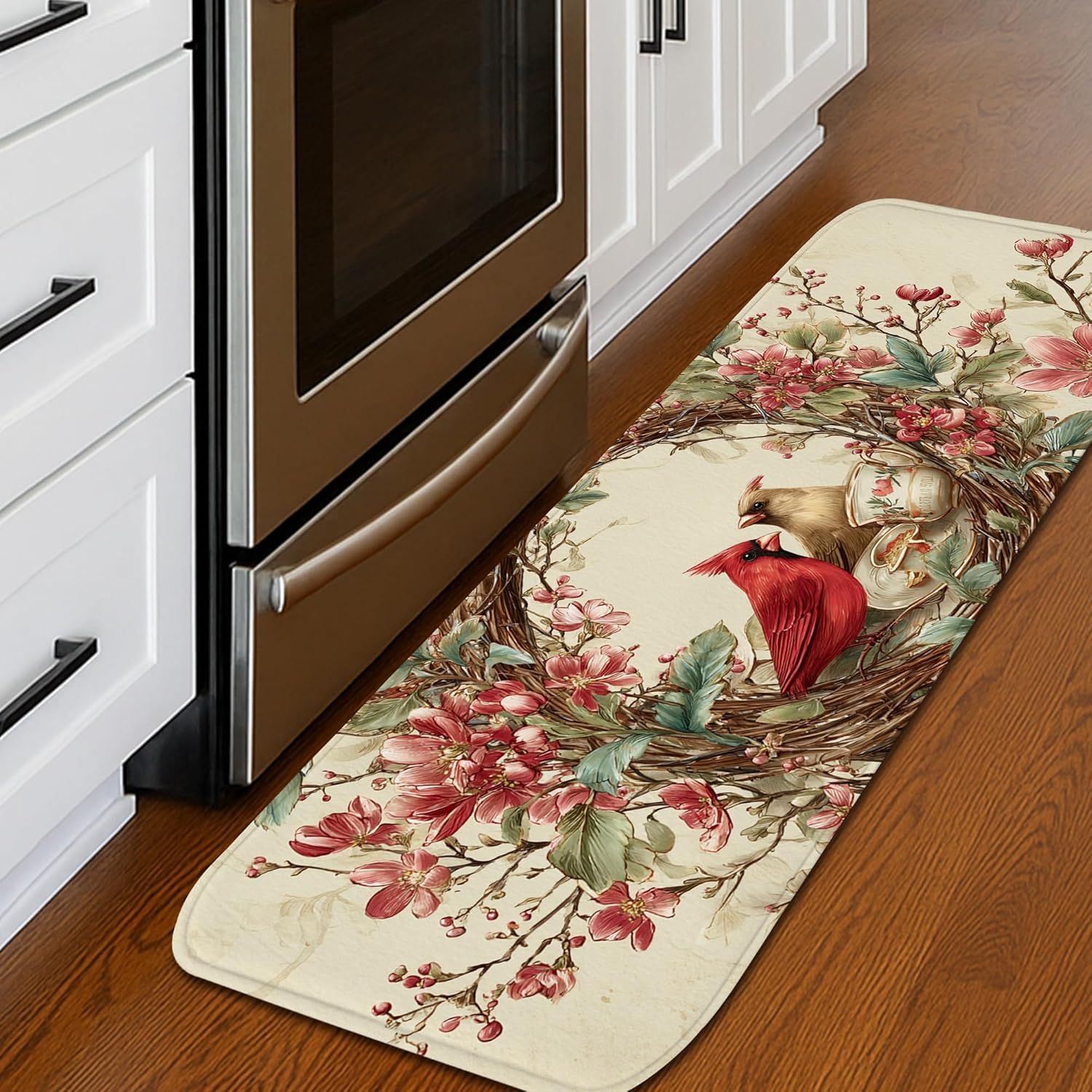 Cardinal Kitchen Mats for Floor, Vintage Bird Blossom Decorative Soft Mats, Cushioned Comfort Washable Non Slip Area Rugs For Kitchen Sinks Laundryroom Bathroom 2PCS