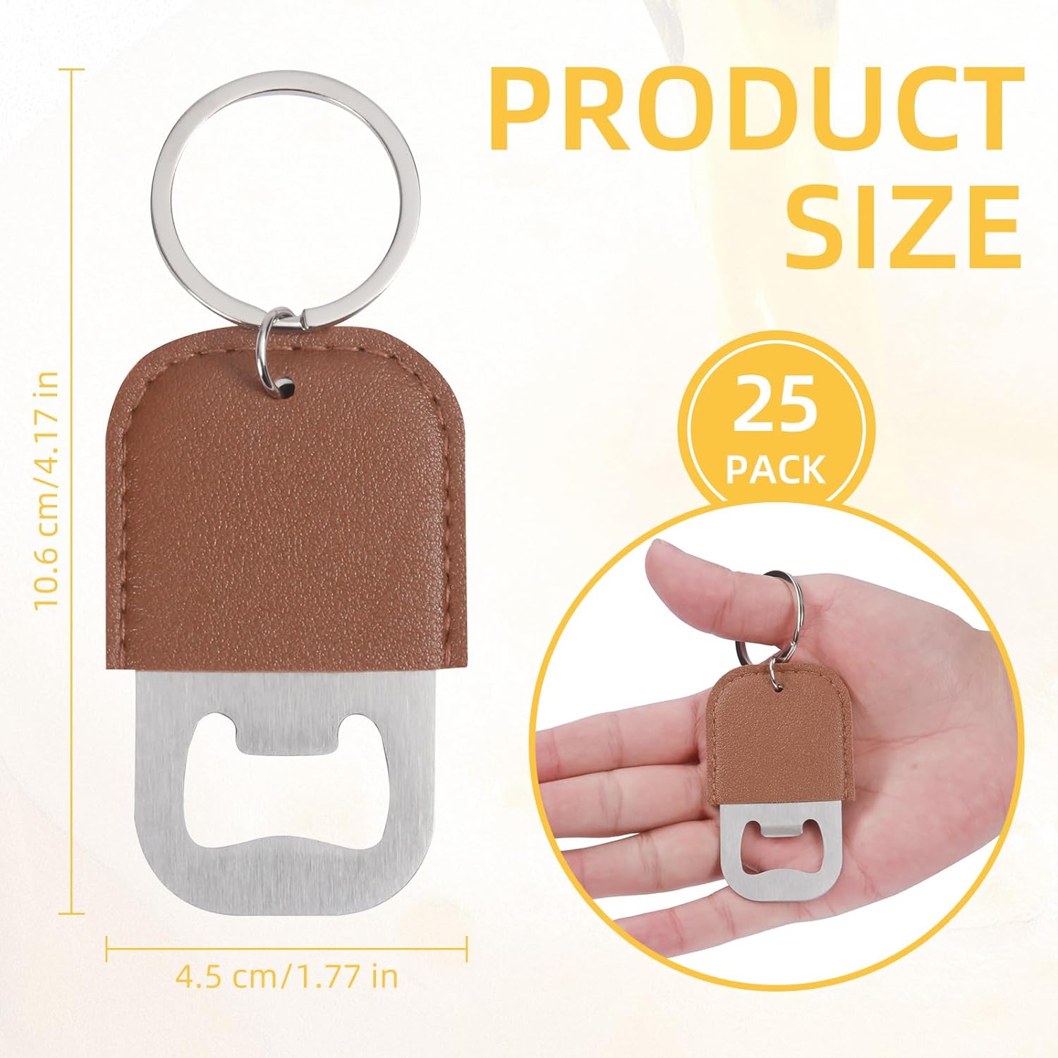 Yugada 25/50/100 PACK Flat Bottle Opener, Leather Bottle Opener Keychain Beer Steel Bottle Opener PU Leather Keychain for Gift Feature: 1. Made of high-quality metal stainless steel with leather, anti-rust and anti-corrosion, strong and firm. 2. Lightweight and cute size - The handle is designed with keychain, which is very convenient for hanging and storing. 3. 25/50/100 pcs of one purchase! Great for party favor, wedding gift, restaurant, bartender, Bar, travel and home. 4. Multi-quantity bottle openers are also very suitable for corporate celebrations, carnivals and ceremonies as gifts. Specifications: Material: Premium metal stainless steel and leather materials Color: Brown Quantity: 25 PCS/ 50 PCS/ 100 PCS Function: Opener Size: 4.17 x 1.77 in/10.6 x 4.5 cm
