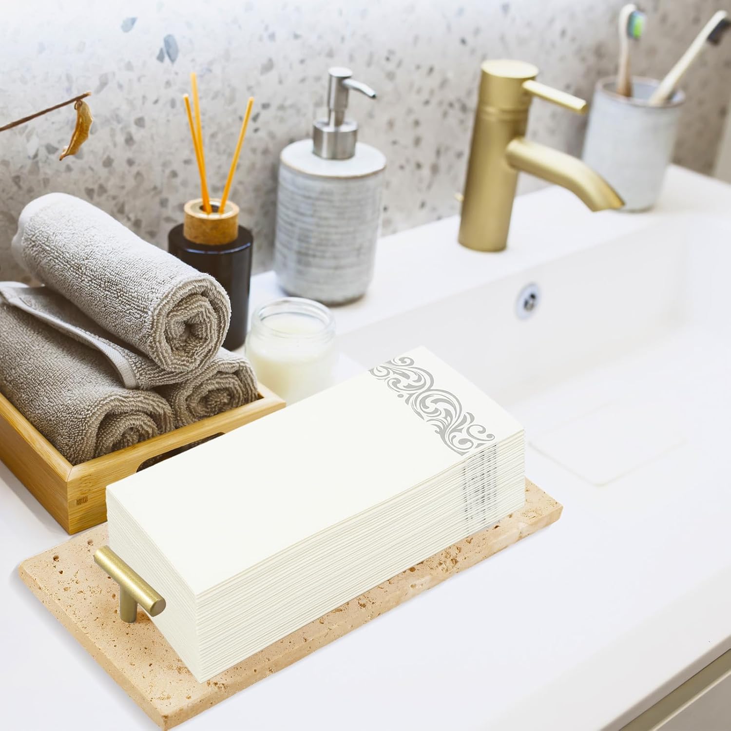 Features: Keep your disposable guest towels neatly arranged with our bathroom napkin holder. Designed for a clean and tidy countertop, this tray not only prevents clutter but also adds a touch of sophistication to your bathroom decor. This elegant napkin holder not only keeps surfaces clear but also complements any room decor. Its space-saving design is ideal for minimalist aesthetics and helps you express your personal style effortlessly. Specifications: Material: Travertine Color: gray Size: approximately 10.63 X 4.53 inches/ 27 x 11.5 cm (length and width) Package includes: 1 x Travertine Guest Towel Holder Tray for Bathroom Notes: Manual measurement, please allow slight errors on size. The color may exist a slight difference due to different screen displays.