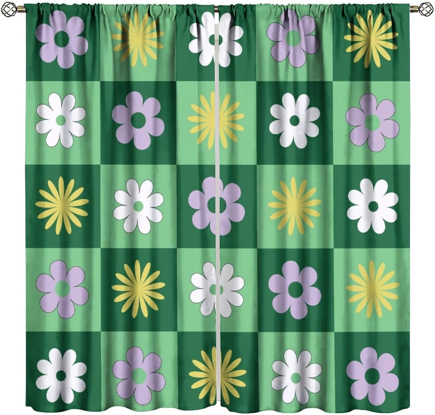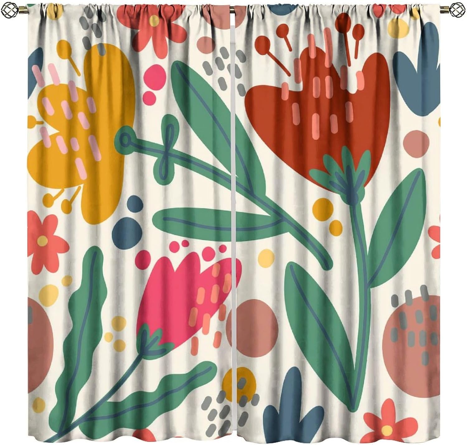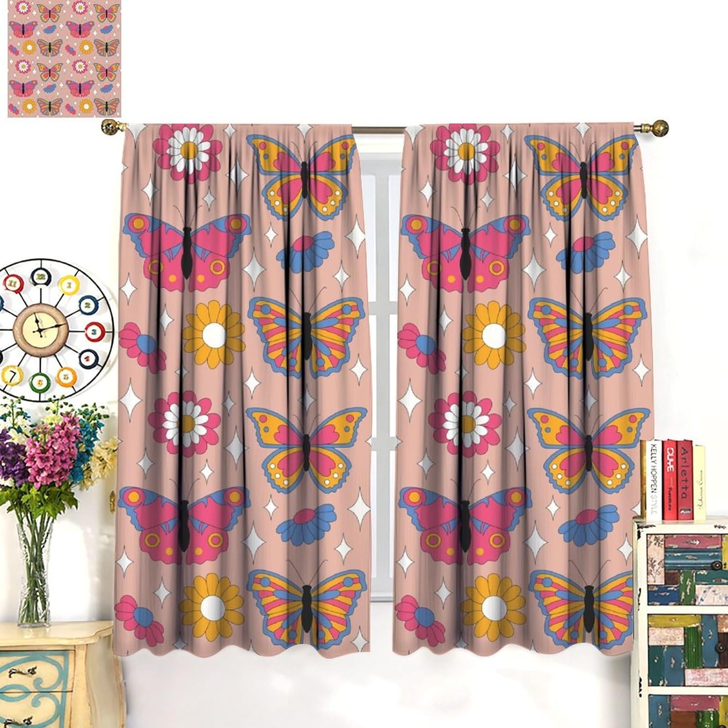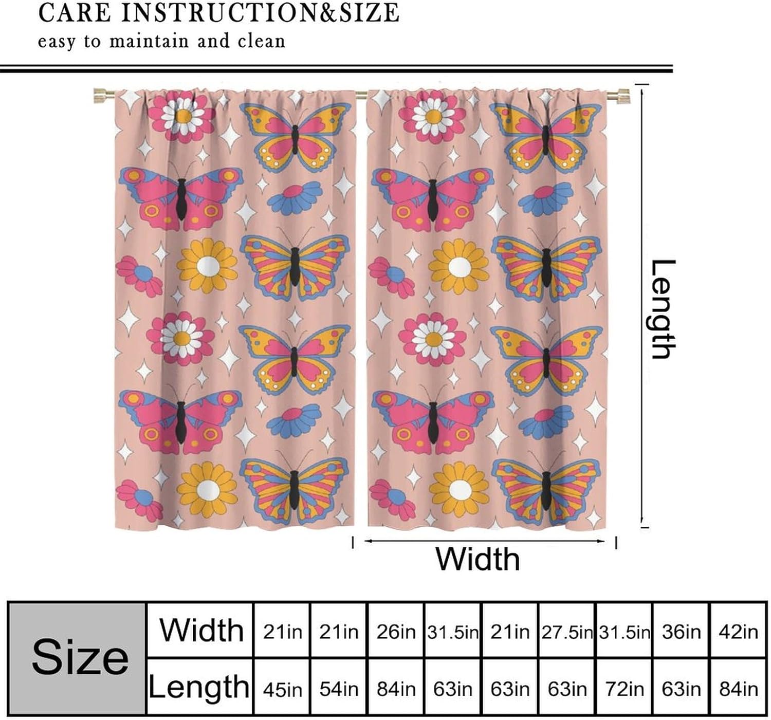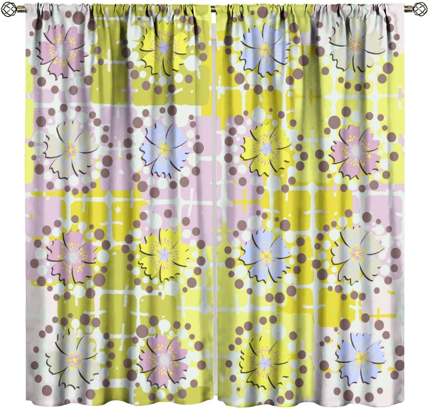 60s 70s Flower Blackout Curtains, Vintage Abstract Geometric Plaid Floral Butterfly Window Drapes, for Living Room Bedroom 42" W X 45" L