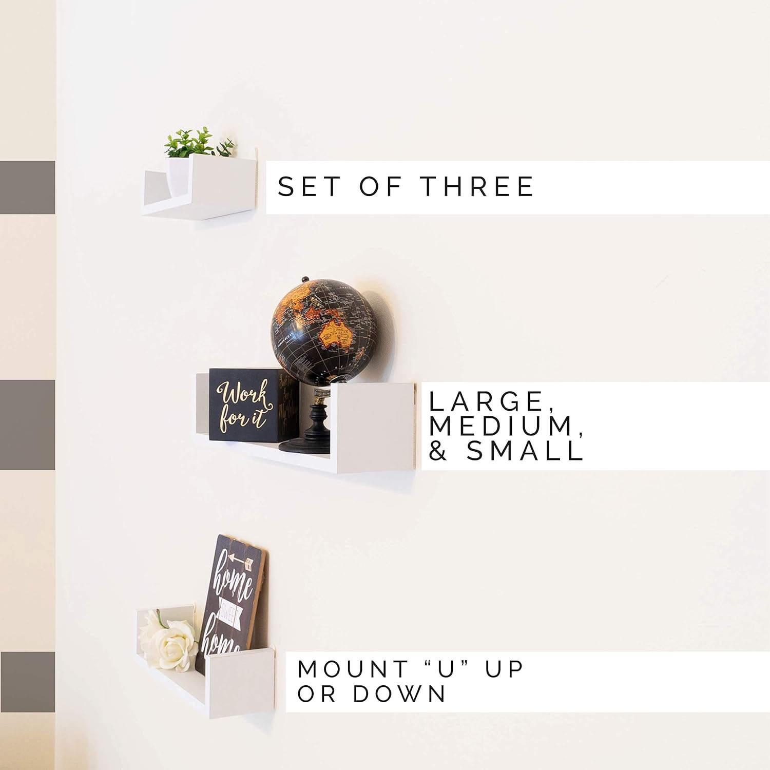 This set of 3 nesting "U" shelves makes space utilization efficient & is perfect for displaying your favorite books, collectibles, photos, toys, awards, CD's, videos, decorative items and more. They can be hung with the vertical sides either up or down, according to the effect you want to create. With the vertical sides up, it is like having a built in bookend. With its contemporary White finish, they are the ideal accent for any living space. Minor assembly is required. Large: 17 x 4 x 4". medium: 13 x 4 x 3.5". small: 9 x 4 x 3.