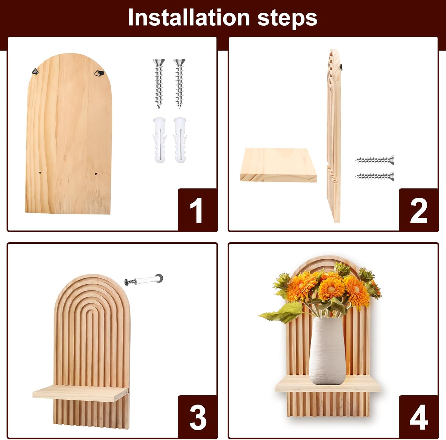 | Assembly Instructions Description | The wooden floating wall shelf has triangular hooks on the back, which can be hung directly. The wooden wall hanging shelves can be assembled in just 3 steps, there are mounting holes on the surface of the wooden board, with the locator plate slots, you can use our matching screws to connect the wall bracket to the horizontal wooden board to increase the stability of the wooden shelf. |
