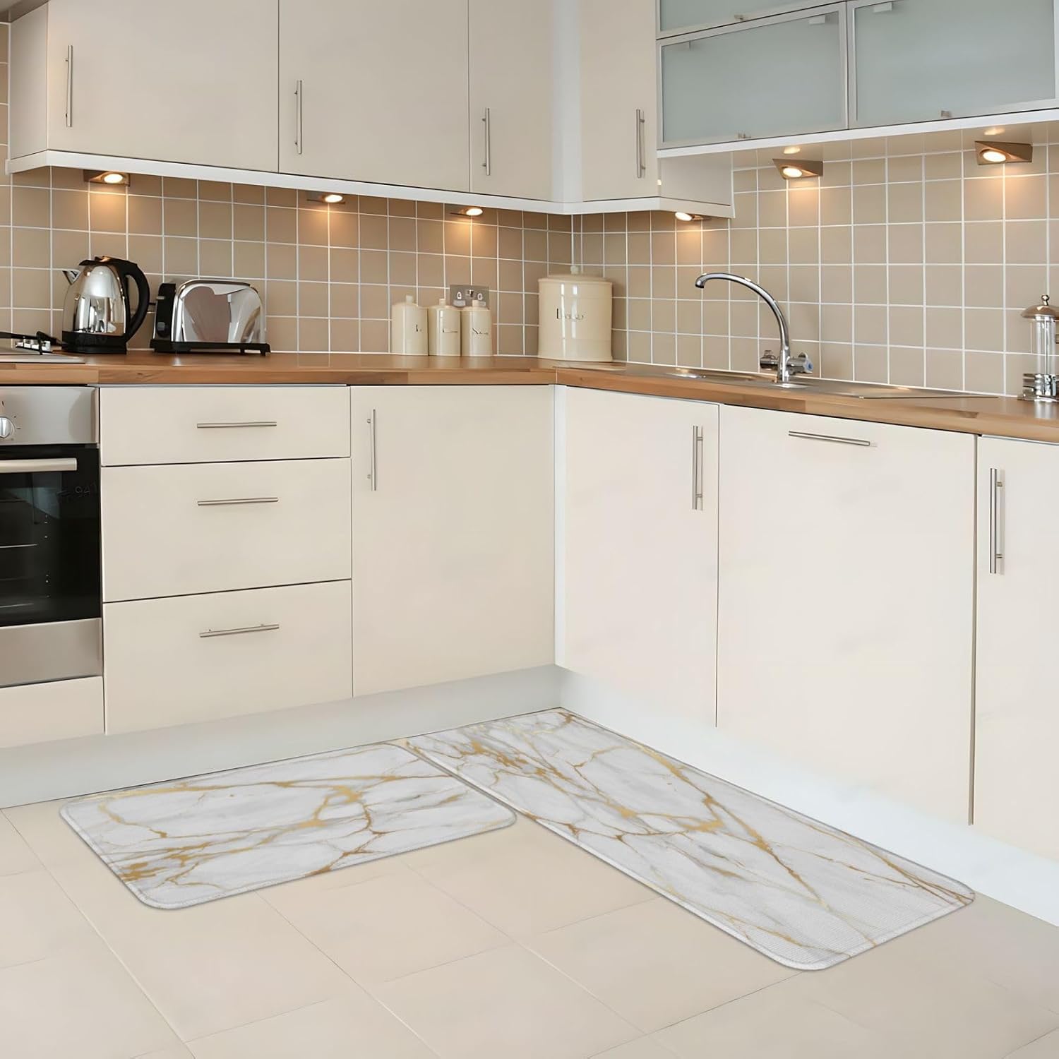 Our kitchen rugs set 2 piece are designed to last long! The non-slip rubber points backing will help keep the mat in place and make sure it does not slide around. The upgrading technology adopted.SpecificationPackage Included: 2 Piece of Kitchen RugSize: 17" x 47.2"+ 17" x 29.5"Material: PolyesterFeaturesNon Skid Mat: The backside has non-slip latex rubber with good grip, so that the floor mat will not slide or curl when used, ensures you won't fall or stumble, making the mats safe to use.Comfortable Rug: Our kitchen rugs and mats are made of polyester, soft and comfortable material that protects your feet from cold and hard floors, bringing comfort and warmth to your feet. Low-pile carpet has a high density, and the pile hardly falls off.Multiple Occasions: Anti fatigue kitchen rugs and mats suitable for variety of styles, good match for your home decor. Perfect for placed in kitchen front of sink, also great as indoor rug, entrance entry rug, front door welcome mat, bathroom doorway mat, bedroom doorway mat, kitchen floor rug, etc.