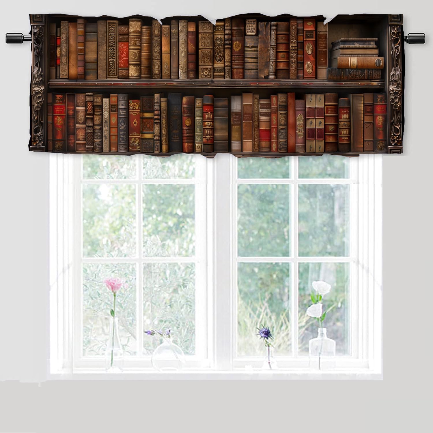 Library Bookshelf Window Curtain Valance Vintage Educational Bookcase Valance for Bedroom Living Room Bathroom Rod Pocket Small Window Curtains can add unlimited charm and fun to your home. Create a more comfortable and unique family atmosphere for you and become an indispensable part of your life!Mindful Workmanship Our valance curtains are made of durable polyester blended fabric, which is moderately soft and can maintain a certain profile. It is undoubtedly an ideal choice for window decoration. In addition, the 3-inch wide rod pocket is more convenient and flexible to apply to more sizes of windows than the grommet valance drapes. (26"-50" wide windows are available). Moreover, when decorating your windows, the top rod pocket can make the valances wavy folds to create more elegant and inviting beauty. All-match Home Decoration The printing of the window valance curtain adopts high-definition printing, full color and vivid pattern, which upgrade your home decoration for easily. Whether your home style is farmhouse/farm, country/rustic, modern, retro, French or Nordic style, this stylish tier curtains can complement it. Valance curtains can also be holiday decorations to increase the atmosphere on important festivals such as Thanksgiving, Halloween, Christmas, and New Year. Unique Holiday GiftsFashionable and elegant curtain decoration will be a funny gift for relatives and friends. It is very suitable for Birthday, Housewarming, Anniversaries and even the upcoming Thanksgiving, Christmas, New Year, Valentine's Day, St. Patrick's Day, etc. Give them a gift!Customer ServiceWe believe that this window treatment will improve your quality of life. If you have any dissatisfaction, please do not hesitate to contact us, your needs are our pursuit!