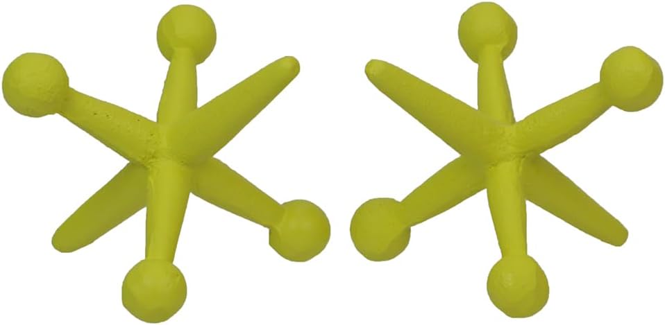 Add a touch of nostalgic charm to your home or office with this pair of giant jack bookends. Crafted from cast iron and adorned with a distressed yellow enamel finish, these bookends showcase a mid-century modern design that effortlessly enhances any decor setting. These versatile bookends are not just functional but also serve as decorative sculptures, making them a conversation starter in any room. Use them to support a stack of books on your shelves, hold down papers on your desk, or display them as eye-catching accents on a side table or mantel. Their size, measuring 3.75 inches high, 4.75 inches long, and 4.5 inches wide, makes them suitable for various spaces in your home. The unique design of these bookends evokes a sense of nostalgia, making them a perfect addition for vintage decor enthusiasts. They also make an excellent gift choice for book lovers, bringing a touch of whimsy and sophistication to their reading space. Let these decorative bookends transform your ordinary book collection into a captivating display that reflects your love for both literature and art.