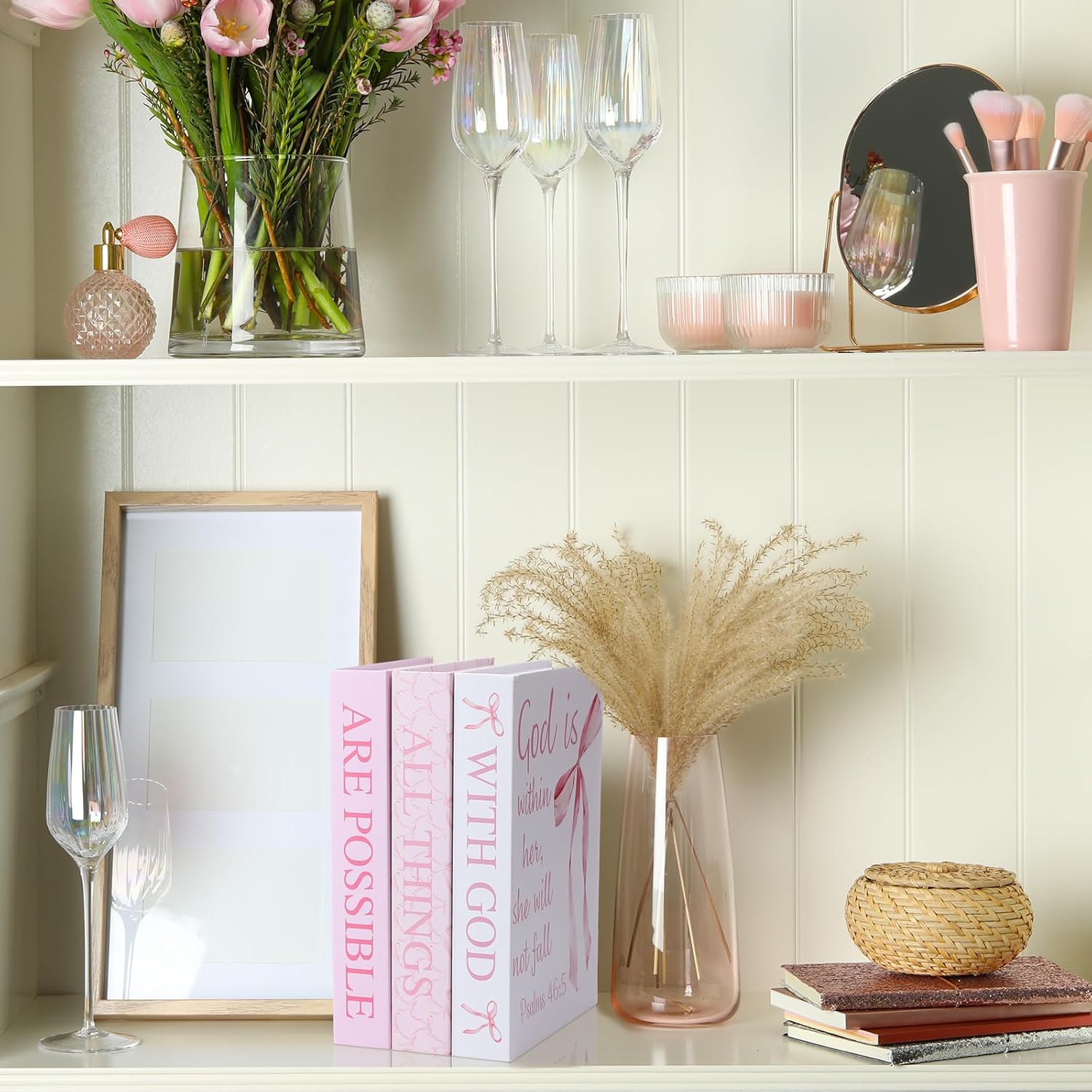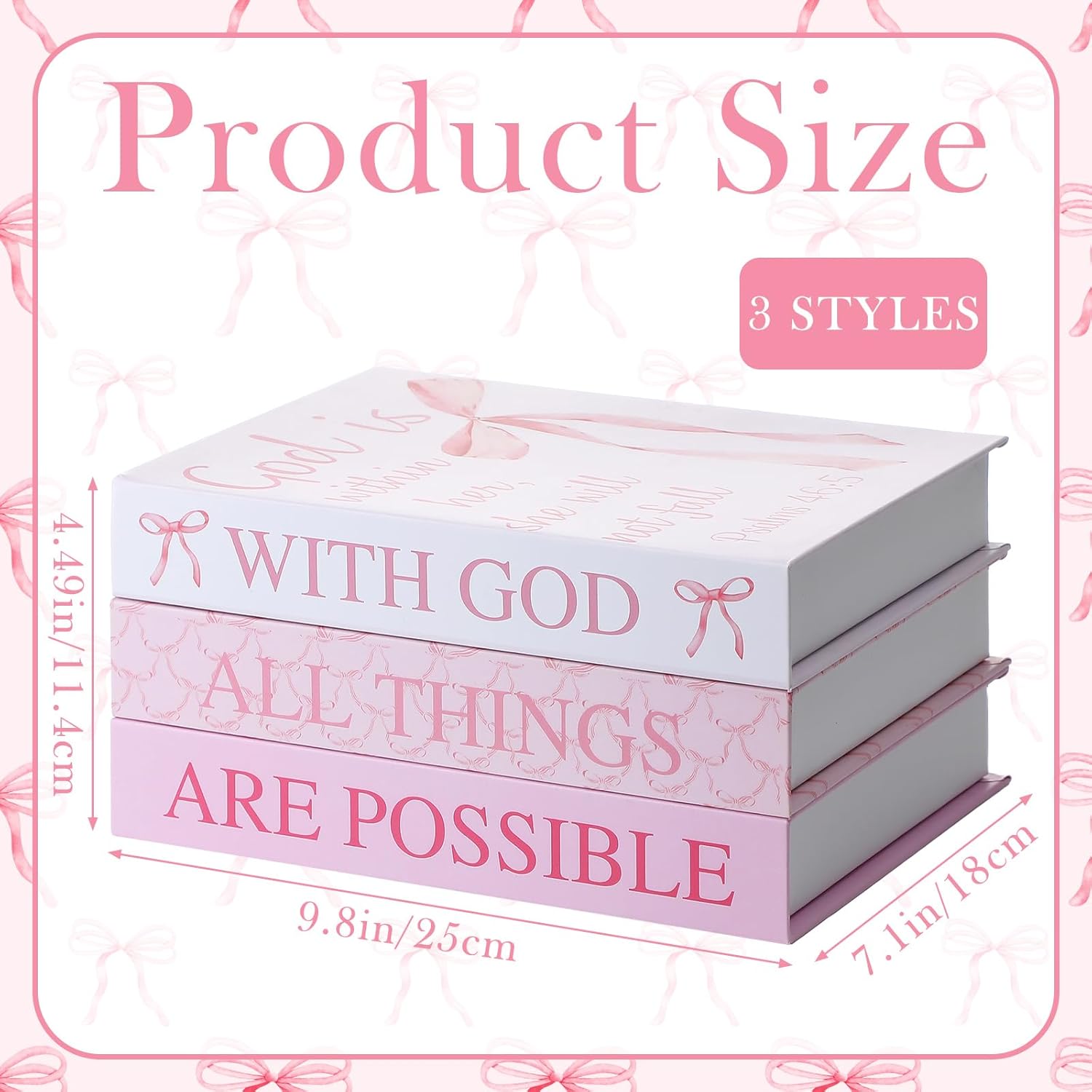 Features: Pink Bow Decorative Books, Coquette Room Decor, Preppy Aesthetic Bible Verses Decorative Fake Books, Decorative Books for Home Decor, Stacked Display Books, with God All Things are Possible Specifications: Material: cardboard Color: pink mainly Size: 9.84 x 7.1 x 4.5 inches/ 25 x 18 x 11.4 cm Package includes: 3 Pcs Pink Bow Decorative Books Notes: Manual measurement, please allow slight errors on size. The color may exist a slight difference due to different screen displays