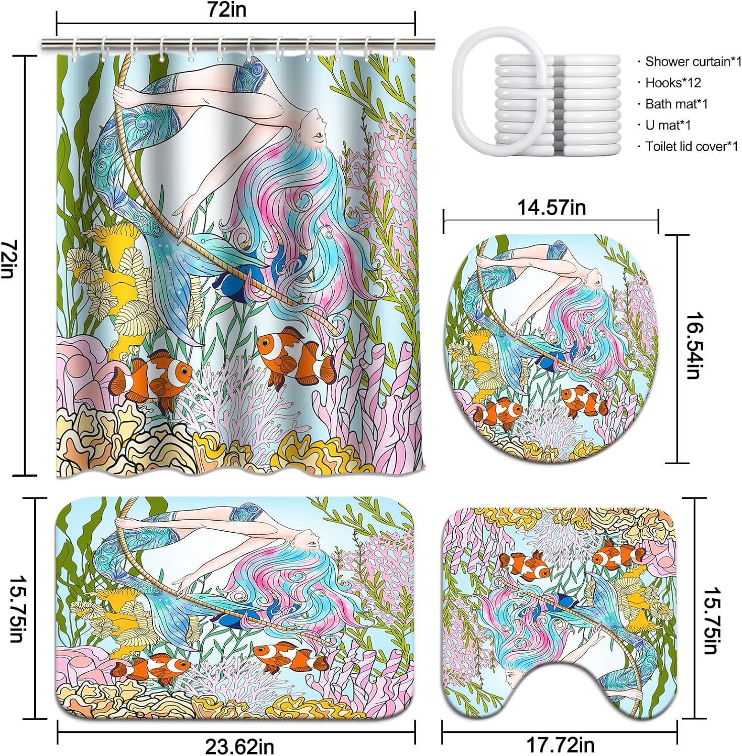 | Included Components | 12-pack Hooks, Bath Mat, Contour Mat, Toilet Lid Cover, shower curtain set |