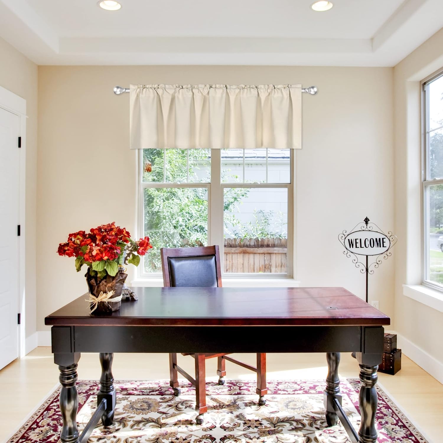 In order to make the room's light and temperature more suitable,DECOVSUN adopted triple weaving technology to make the fabric thicker,to increase its shading and heat insulation performance,can adjust part of the room's light(can block out 20% sunlight and prevent 30% UV ray from the window),block heat from entering,reduce some noise,make your life better.Quality Fabric:100% high quality polyester,thicker and better wrinkle resistance,soft and comfortable to the touch,can be used repeatedly for a long time.Size:100"W x 18"L,including 0.8" header.Rod pocket size is 3" ,can fit 1.9" rod well.Washing Instructions:Machine washable in gentle cycle and cold water,do not bleach.Warm iron and tumble dry at low temperatures.Colorful:In order to cater to the preferences of more customers, this valance has many colors to choose from:white,gray,black,orange,lilac,bright yellow,light gray,rust,sky blue,royal blue,red,navy,deep green,beige,coffee,aqua,purple,gold yellow,baby pink,coral and so on.DECOVSUN,vibrant design bring sunshine into your life.