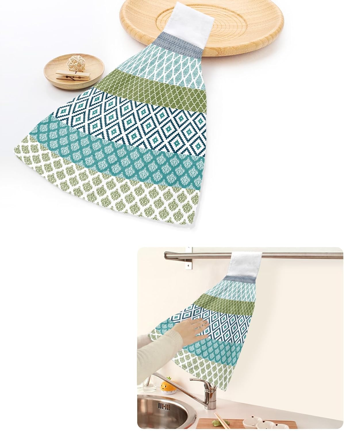 Hanging Tie Towels Set Daily Decor for HomeProduct DescriptionSize Dimensions:Each Hand Towel 18x14 Inch. Print: Single-sided printing, one side is a beautiful pattern, the other side is white.Durable & Absorbent MaterialThe hand towels for kitchen are made of absorbent microfiber, lightweight, highly absorbent, quick-drying making them perfect for cleaning and suitable for all your household tasks.Unique Hook & Loop DesignThe convenient hanging design keeps towels from sliding off onto the floor. Easy to hang anywhere ideal for daily use. The soft bath wash towels will not take up any space and is also convenient to carry.Ideal Kitchen AccessoriesOur dish towels will refresh your kitchen, is easy to mix and match with other kitchen decorations. Add flair to your kitchen decor with colorful kitchen dish towels.Precise EdgingExquisite edging and cable routing can improve reusability, and it is not easy to tear, wear and lose the thread after cleaning.More Scene UsesBoth decorative and practical, it is an ideal choice for your kitchen, restaurant, hotel, coffee shop, dessert shop, bathroom, toilet tabletop and other occasions. Great for drying off dishes, these versatile towels are perfect for wiping your hands, cleaning up kitchen counters, carrying hot dishes, and much more. They can be hung anywhere after use.Vibrant Pattern & Perfect GiftOur hand towels come in a variety of vibrant colors and patterns for each season and occasion. Give your space a real personality, the perfect gift for various holidays.Easy CleanMachine washing in cold, do not bleach, tumble dry low and low iron if needed.