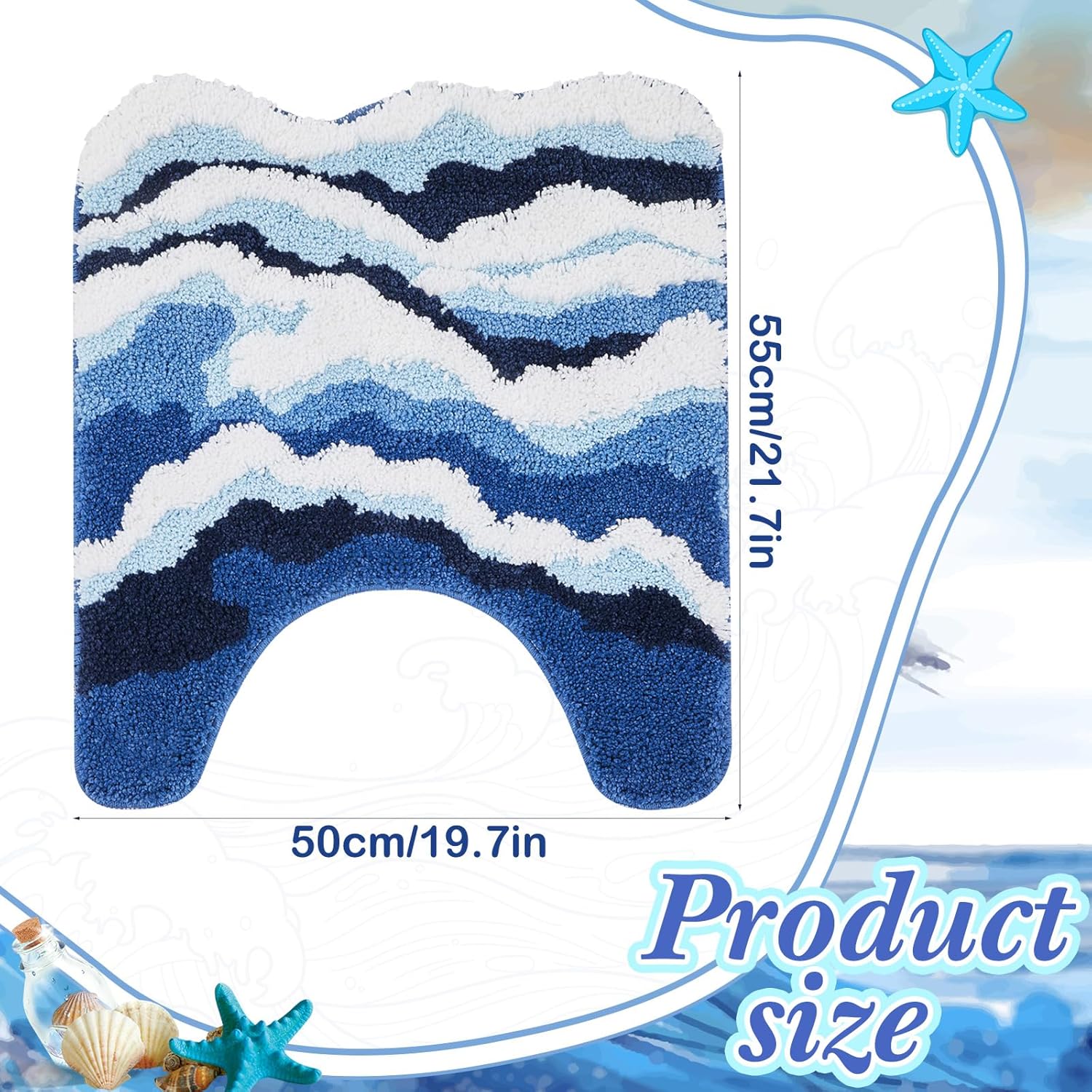 Features: Crafted with plush, soft fabric, this non-slip U-shaped ocean rug offers exceptional comfort underfoot while delivering strong water absorption to keep your bathroom floor dry and tidy. Its machine-washable design ensures easy maintenance, combining practicality with trendy 3D wave decor for a functional yet visually appealing bathroom essential. Specifications: Material: soft tufted fabric, TPR rubber Color: multicolor Size: about 21.63x15.75 in, with an opening diameter of about 9 inches Package includes: 1 x Wave Non-slip U Shaped toilet rug Notes: Manual measurement, please allow slight errors on size