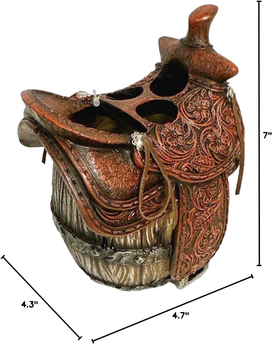 This rustic western saddle on a barrel toothbrush holder is the perfect accessory for your western cabin decor! Crafted in the shape of a weathered barrel with a ornate western saddle straddling on top, this sturdy toothbrush holder looks great in the guest bath, master bath, and kids bath a like. Both practical and stylish, this western horse saddle holder makes a great decor accent that fits with a variety of decorating styles: western, country, Native American, cabin, and more. The decorative saddle toothbrush holder measures 4.7"L x 4.3"W x 7"H and makes a great gift for Mother's Day, weddings, birthdays, and more.