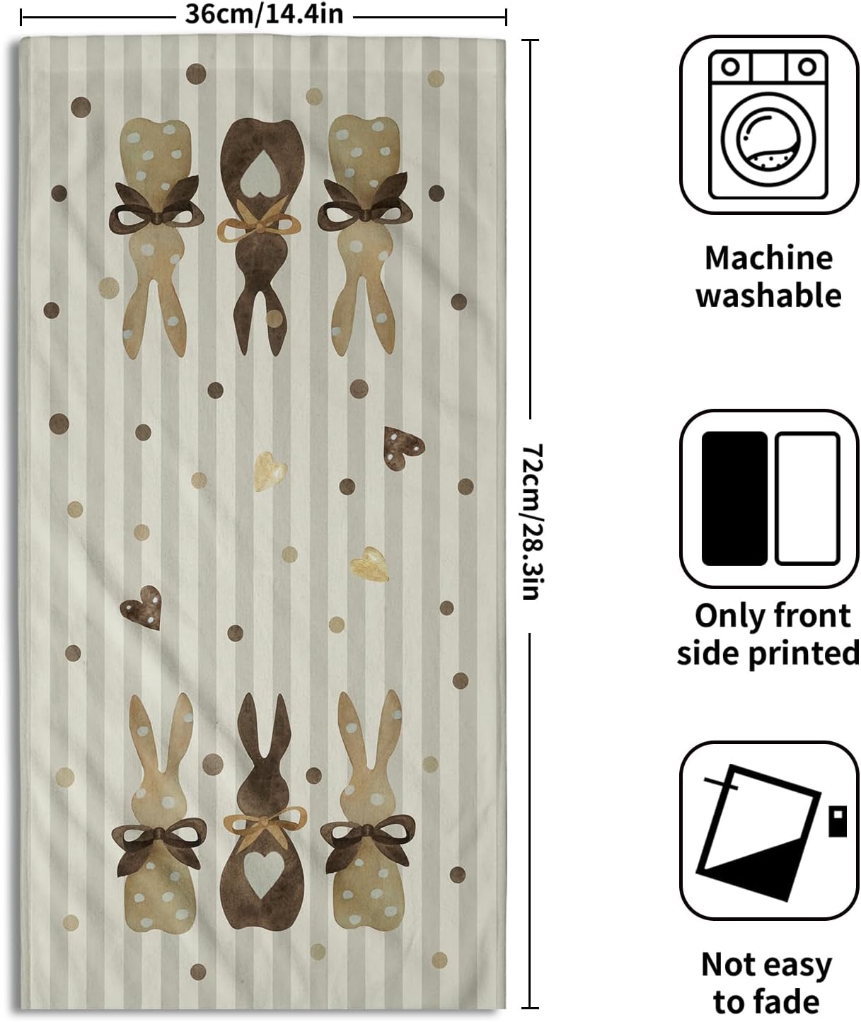 Our spring hand towels are very soft, comfortable, absorbent and durable, allowing you to enjoy dryness and comfort immediately after bathing, and say goodbye to the discomfort of wetness.In terms of design, our easter bath hand towels pursues simplicity without losing the sense of fashion. The exquisite edging process is not only beautiful and generous, but also improves the durability of the towels. The two-piece set meets your all-round needs for daily cleaning and bathing. Whether for personal use or as a gift for relatives and friends, it is a thoughtful and practical choice.Product SpecificationsPackage includes: 2 pcs hand bath towelsSize: 28 x 14.5 inches/72 x 36 cmMaterial: Made of polyester on the front and high-quality cotton on the back, it absorbs water quickly, is durable, soft and comfortable.Multiple occasions: Bathroom, kitchen, guest room, bedroom, car, hotel, spa, gym and other occasions.Washing instructions: Machine wash at low temperature or hand wash, gentle wash, no bleaching, no ironing.Warm Tips1. Please allow 1-3mm error due to manual measurement.2. Due to the brightness of light, the picture and the actual object are slightly different, please understand.