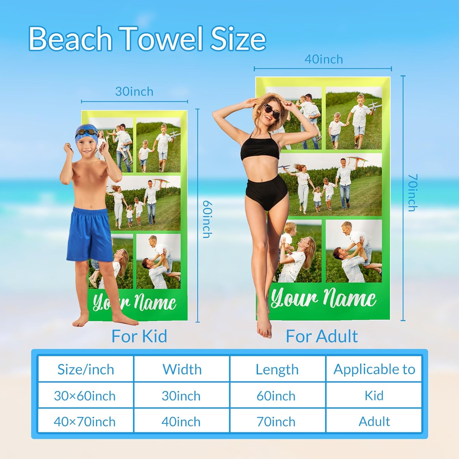 Size Options: 30x60 inches or 40x70 inchesMaterial: Premium microfiber - soft, lightweight & quick-dryingMake It Your Own!Personalize your beach towel with a name, photo, logo, or custom design - a great gift for family, friends, or even your brand! Whether it’s a memorable vacation snapshot, a fun monogram, or a creative digital print, transform your towel into a special summer essentials.Key Features:Quick-Dry & Highly Absorbent - Dries faster than cotton, so you can enjoy the sun without staying damp.Sand-Resistant Fabric - Shake off sand effortlessly and keep your towel clean.Versatile & Multi-Use - Great as a beach towel, bath towel, pool towel, gym towel, or yoga mat cover.Fits Beach Chairs - Two size choosen provides full coverage on most lounge chairs.Compact & Travel-Friendly - Lightweight yet large enough for comfort, ideal for camping, picnics, or seaside wedding.Easy Care – Machine washable for hassle-free cleaning.Ideal For:Beach vacations & pool daysOutdoor adventures & campingYoga, gym, or sport useSpecial personalized gifts (birthdays, bridal parties, family trips)Make every moment special with a custom-designed beach towel that’s as special as you are!
