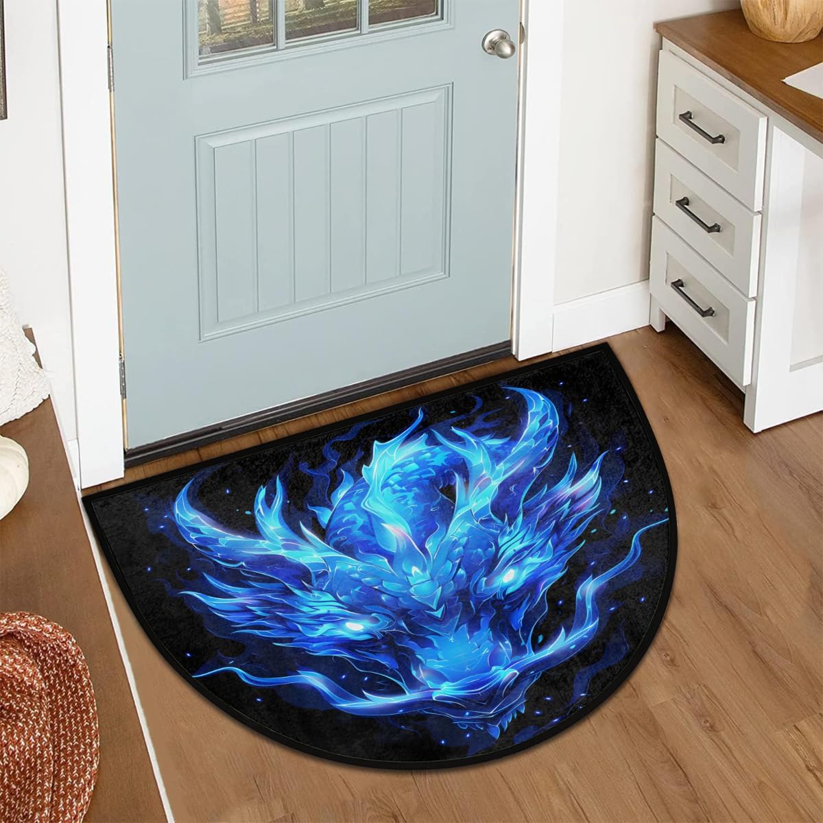 Half Round Doormat for Indoor Entrance Holiday DecorPRODUCT SPECIFICATIONSSize: 36x24in / 91.4x61cm Material: Front side --100% microfiber polyester Backside--non-skid dot plastic Shape: Half Round/Semi Circle/Half MoonPackage:1 x Half Round DoormatsPRODUCT FEATURES:1, Low Profile: The semi circle door mat rug is low profile, floor mat size is 36 x 24 inches, which is perfect size to dress up your door.2, Anti-skid Backing: Half round doormat has anti-skid backing, which making it non-slip and not easy to move.3, Machine Washable: Our half moon door mat is easy to clean, it is machine washable, you can use a damp cloth dipped in a small amount of mild soap to wipe.4, Absorption:The semi circle floor mat is made of soft memory foam and high-density space elastic cotton interlayer composite material, which makes the floor mat absorbent.5, Multi-Purpose Usage: Half round doormat suitable for any room, bedroom, living room, dining room, children's room, game room, study room, dormitory, kitchen, office, corridor, entrance, patio, porch, or hardwood floor, garage, home decoration.6, Perfect Gift: It can be great gift choice for Mother's Day, Father's Day, Halloween, Christmas, Thanksgiving, Birthday, New Year, Home Decor and more.