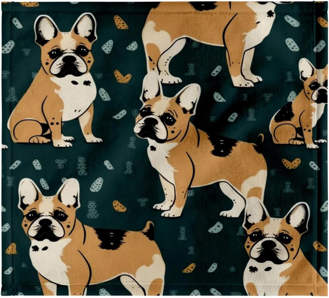 Mid-Century Modern French Bulldogs. Everybody loves Frenchies Towel is great to use in the kitchen, bathroom or gym. This 15 by 22 inch, hand/sports towel allows you to customize your room with a special design or color. Great for drying dishes, hands and faces. Suitable to put in any sports bag. Image will not fade after washing. Machine wash, tumble dry low, do not bleach. Towel will regain its fullness after the first washing. Made of: Printed side 100% polyester and reverse side 100% Terrycloth cotton. Image printed on polyester side/ terry cloth side is blank white.
