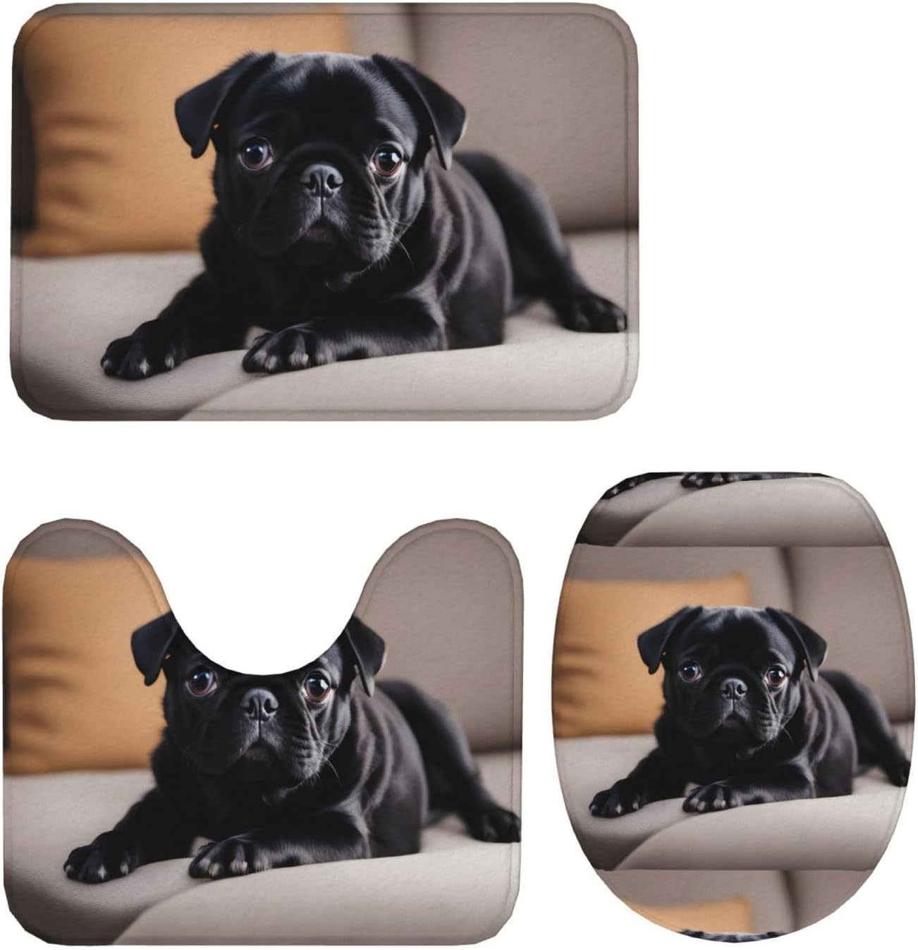 Elevate the look and feel of your bathroom with the WHJWXC Cute Black Pug Dog Printed Bathroom Rugs Sets of 3. Made from 100% polyester fiber and soft flannel fabric, these rugs offer a luxurious and comfortable experience for your feet. The non-woven fabric bottom with plastic dots ensures a secure grip on the floor, preventing slips and falls in high-moisture areas. These rugs are easy to clean, environmentally friendly, and designed to withstand daily wear and tear. Whether you place them in the toilet, dressing table, or children's bathroom, these rugs will add a touch of style and functionality to your space. The U-shaped toilet floor mat provides a perfect fit, while the moisture-blocking and water-absorbing properties keep your floors dry and clean. Treat your feet to the thick and plush texture of these rugs, which are durable, anti-shedding, and resistant to deformation. Upgrade your home decor with these stylish and practical bathroom rugs today.
