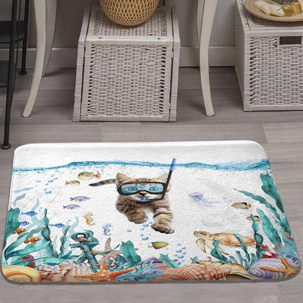 Transform your bathroom into a playful oasis with our funny cat small bathroom rug mat! Featuring an adorable design with funny cats and ocean sea animals, this bath rug adds a whimsical touch to your bathroom decor. Crafted from soft microfiber material, this bath mat is not only cute but also highly functional. Its water-absorbent properties quickly soak up moisture, keeping your bathroom floor dry. And when it's time for a clean, simply toss it in the washing machine for easy maintenance. Elevate your bathroom decor and enjoy both style and functionality with our funny cat small bathroom rug mat!
