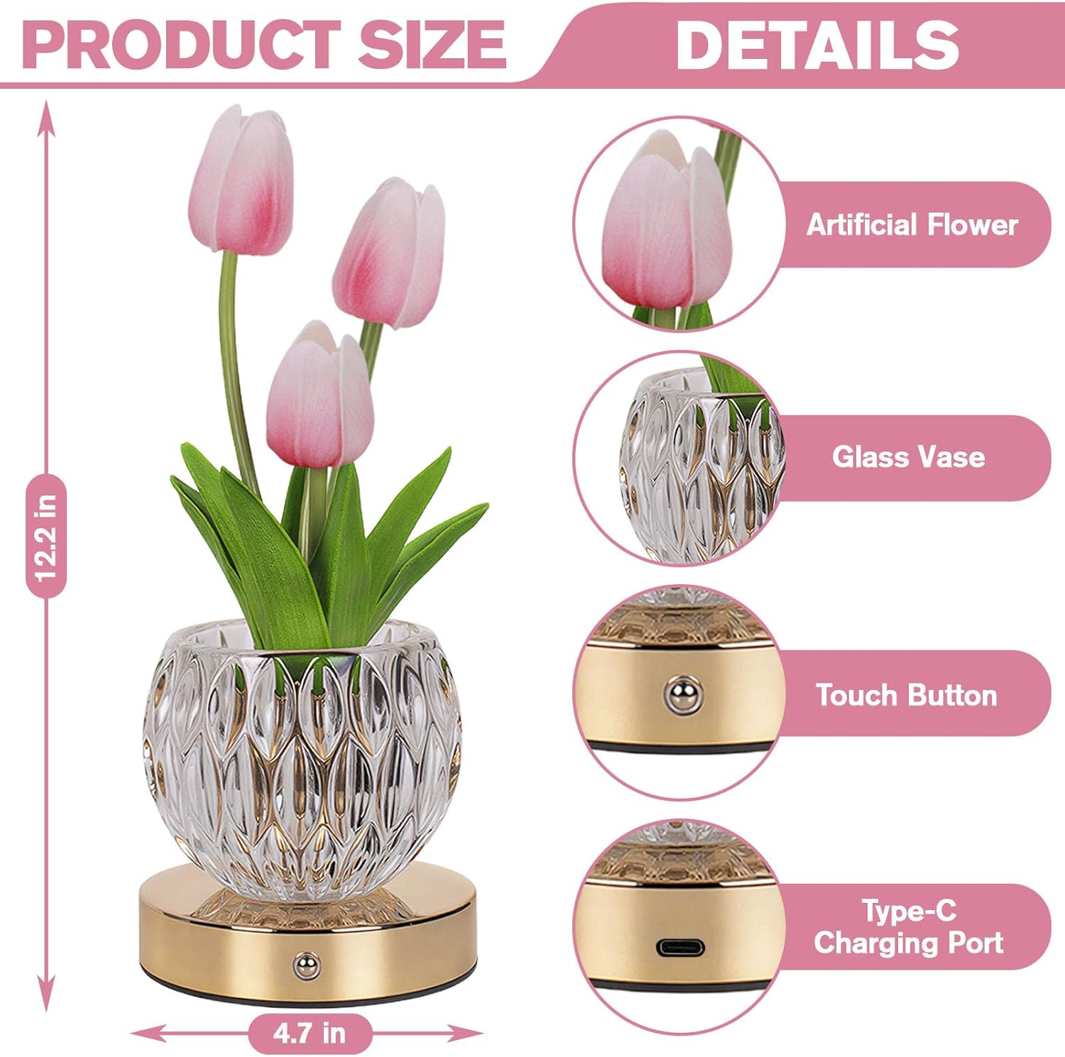 16 Color Changing Tulip Table Lamp with Remote Cordless Table Lamp Desk Lamp Night Light Touch Stepless Dimming Flower Lamp LED Atmosphere light Decorative Landscape Light Beside Lamp USB Rechargeable Artificial Tulip Table Centerpieces Desk Lamp Our LED flower is not only an elegant bonsai with the spirituality and natural taste of flowers; At night, it is also a flower table lamp with soft and comfortable lighting, breaking the dullness of space, bringing warmth and flexibility to your small home, adding a warm and romantic color. Suitable for bedside tables, desks, dining tables, children's rooms, bedrooms, dormitories, living rooms, office, meeting room etc. Places with flowers are always full of vitality, and adding some flower lamp at home makes your time at home more comfortable and adds unique colors to the space. Specifications Product Name: Tulip Table Lamp Material: PU + Glass + LED Light Color: White Light, Red Light, Green Light, Blue Light Light Source: LED Power Source: USB Charging Switch Mode: Touch Switch / Remote Remote Control Function: 16 Color + 4 Lighting Modes + Stepless Dimming Product Size: 4.7 x 4.7 x 12.2 Inch Package Size: 5.6 x 5.9 x 11.7 Inch Package List 1 x Tulip Desk Lamp 1 x Remote Control 1 x USB Cable 24 Hours Customer Service 100% Customer Satisfaction: when you are not satisfied with our product or you have any question, please contact with us to get a after-sale service, we will give you a satisfied response. Note 1.Due to the light and screen setting difference, the item's color may be slightly different from the pictures. 2.Please allow slight dimension difference due to different manual measurement.
