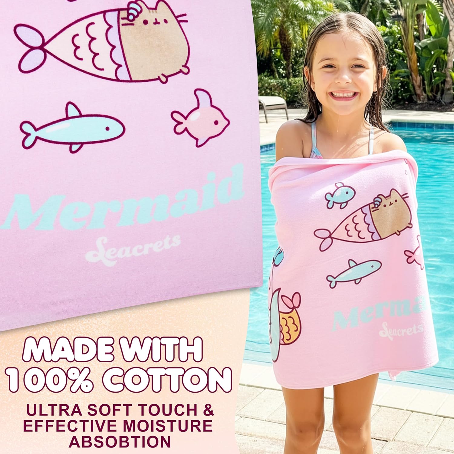 Wrap your little one in comfort and fun with this Pusheen beach towel for girls. Made from cotton, this soft bath towel features a bright mermaid-themed Pusheen print that brings smiles after every swim, bath, or beach day. Whether used at home as a cotton bath towel or on the go as a travel towel for kids, it’s a lightweight and absorbent choice for families. This girls’ towel measures approximately 49.2 x 29.5 inches, making it large enough for tweens. It's easy to pack into swim kits, beach bags, or pool totes and works well as part of your child’s summer or bath essentials. With one side made of soft loop terry cotton and the other featuring a smooth printed finish, it balances comfort and colorful fun. Use it as a kids beach towel set, pool towel, girls bath towel, or part of your beach vacation accessories. The cute mermaid design and playful Pusheen artwork make it more than just a towel, it’s a favorite among kids who love characters. It’s machine washable for easy care and folds flat for travel or storage. If you're looking for a gift, this Pusheen towel set makes gifts for birthdays, holidays, summer breaks, or swim kits. Loved by girls, teens, it’s one of those travel essentials that brings joy wherever it goes.