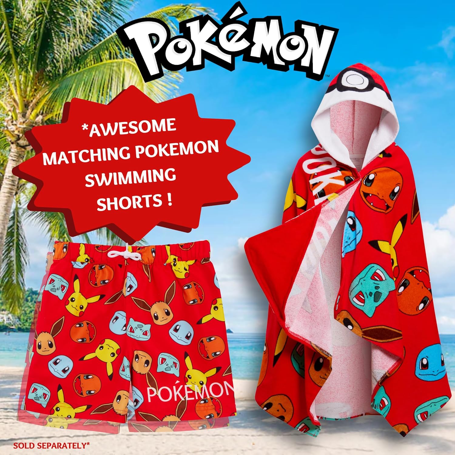 POKEMON HOODED TOWEL 2 in 1 towel / poncho. Outstanding value design that combine the use of a large towel that also can be used as a poncho / wrap with our unique hood and pockets. No need to worry about getting value and use out of your holiday poncho as this towel is perfect for home all year round. Official Pokemon merchandise in an exclusive design from the children's brand Ultimate Kids for all Pokemon trainers. Pokemon is an all time favourite childrens TV and video game series and we have captured some of the favourite characters in these towel designs. Each towel is a unisex design for both girls and boys with a cool images of the Pokemon characters Pikachu, Meowth, Charmader and Eevee. The hood is designed with the iconic pokeball. We have also added pockets in the end corners to fit hands to be able to wrap the towel around when worn. These towels are made form super soft 100% cotton toweling material and are fully machine washable. They are great for so many uses. Holidays on the beach as they can be used as a towel to lay on the sand by simply folding the center hood under the towel. These towels are also great as a warm snuggle cover up after swimming, perfect when they get out of the pool. But these towels are not limited to holidays they are a firm favourite at bath time or going to the swimming baths - no more dropping your towel on a wet floor as you can place the hood over head while drying. Each towel measures an estimated 125cm x 75cm. They also make perfect gifts for every Pokemon fan. Why not pair this towel with our matching shorts for the ultimate Pokemon swim set.