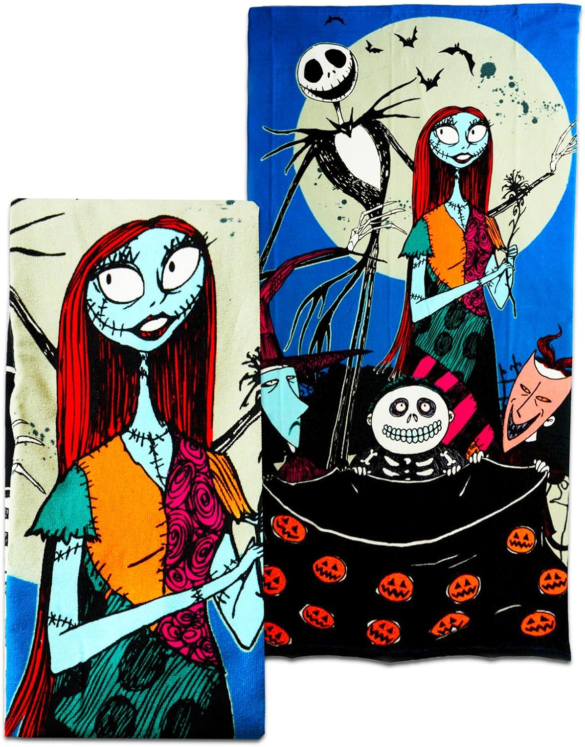 Nightmare Before Christmas Bath Towel Set - Bundle with 27" x 54" Jack Skellington Microfiber Pool Towel Plus Stickers, More | Jack Skellington Beach Towel for Kids and Adults. This Nightmare Before Christmas bath towel set includes one microfiber towel measuring 27" x 57" and featuring colorful artwork of Jack Skellington, Sally, and Oogie Boogie's boys Lock, Shock, and Barrel. Sure to be a hit with Nightmare Before Christmas fans of all ages, this Jack Skellington towel is great to give as a gift to anybody who loves Nightmare Before Christmas and the beach or pool! Make bath time fun for everyone! Kids and adults alike are sure to love being wrapped up in this soft microfiber Nightmare Before Christmas towel after a bath or shower. This officially licensed Disney Nightmare Before Christmas bath towel set is sure to be a hit with all Jack Skellington fans, kids and adults alike. Includes bonus stickers and a Beach Kids bat door hanger.