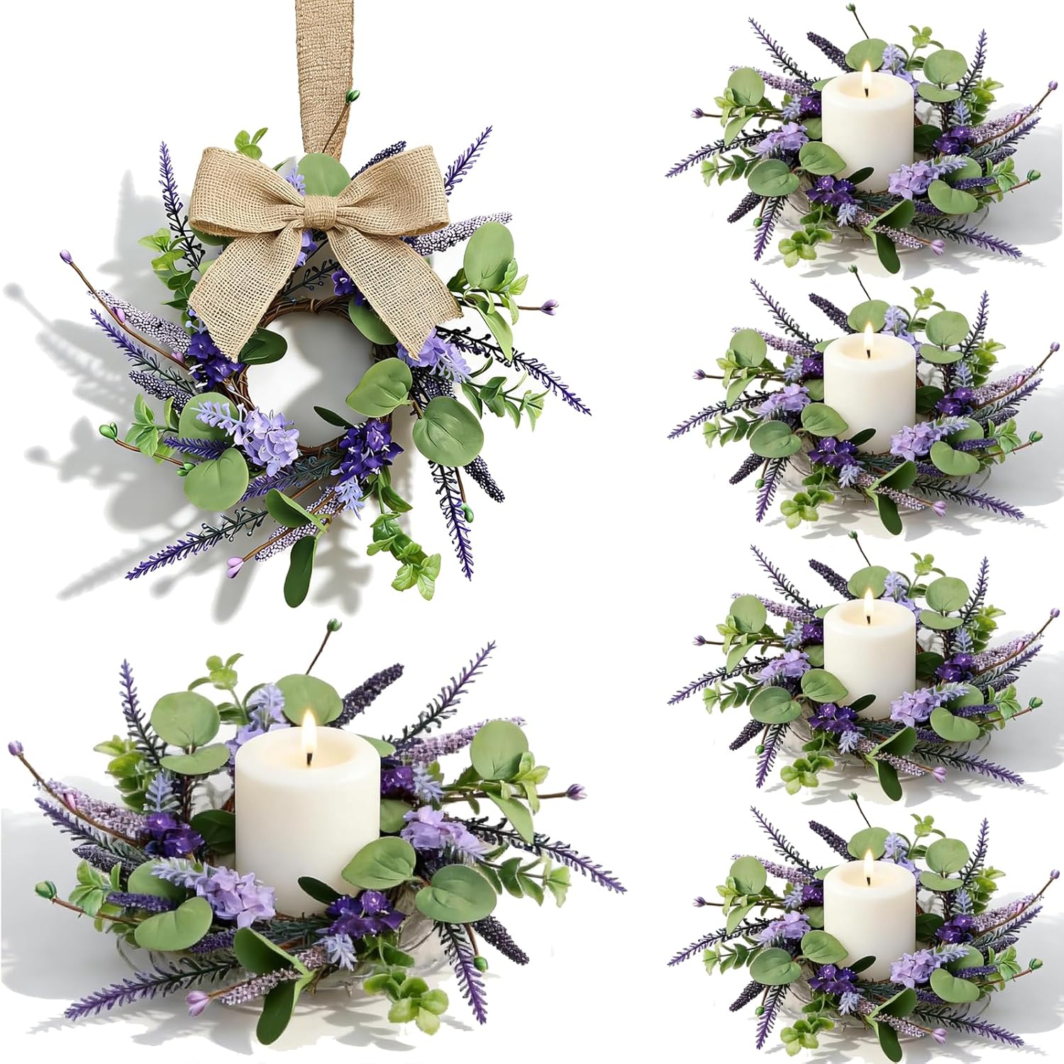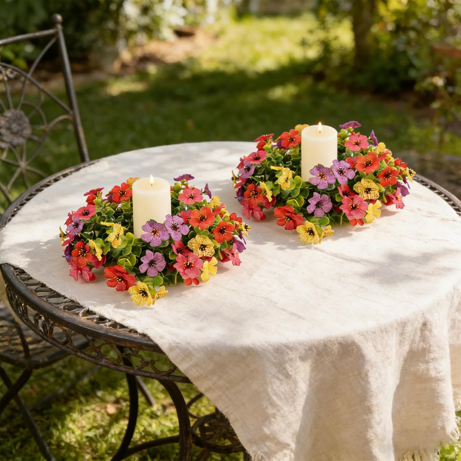 Features: These summer outdoor artificial floral small hanging wreaths is designed to bring vibrant, long-lasting color and natural charm to your home decor or special events. Each UV resistant faux plastic flower mini candle ring wreath is built on a flexible, lightweight green wire frame, which allows for easy shaping and hanging. The frame is wrapped with lush, realistic green foliage, including small, oval-shaped leaves that mimic the look of fresh eucalyptus or boxwood. This greenery provides a dense, full foundation for the colorful blooms. The wreath features a rich mix of artificial flowers in a bright, cheerful palette: Large, open-faced flowers with textured petals, reminiscent of petunias or geraniums, form the primary focal points. Delicate, daisy-like flowers with dark centers add a sunny contrast. Smaller, trumpet-shaped purple flowers (similar to petunias or lobelia) are interspersed throughout to create depth and visual interest. This versatile sizing makes the set suitable for a variety of uses, from everyday home decor to special occasions like spring celebrations, baby showers, or Easter. Specifications: Size: Inner diameter of approximately 3.14-3.54 inches/8-9cm External diameter of approximately 9.84-11.81 inches/25-30cm Package includes: 6 x small spring summer wreath Notes: Manual measurement, please allow slight errors on size. The color may exist a slight difference due to different screen displays.