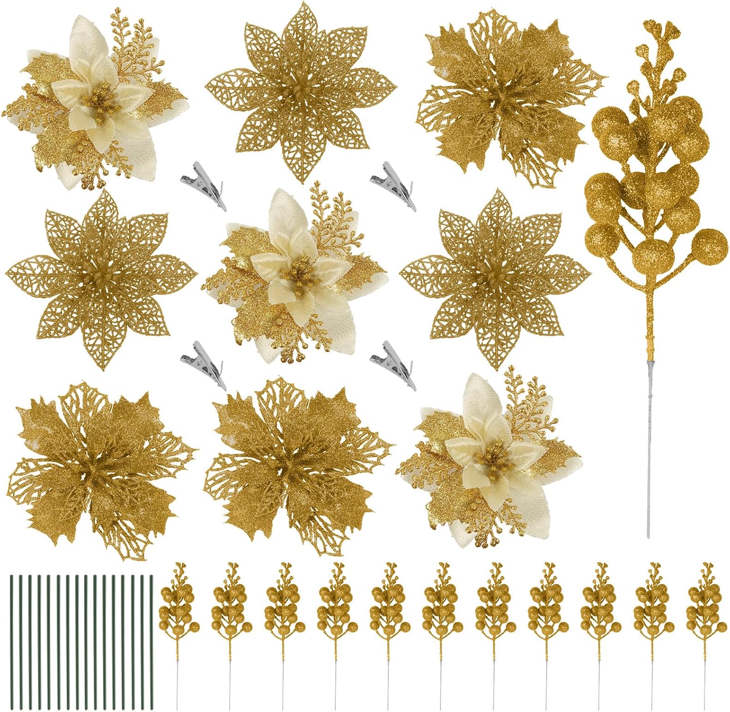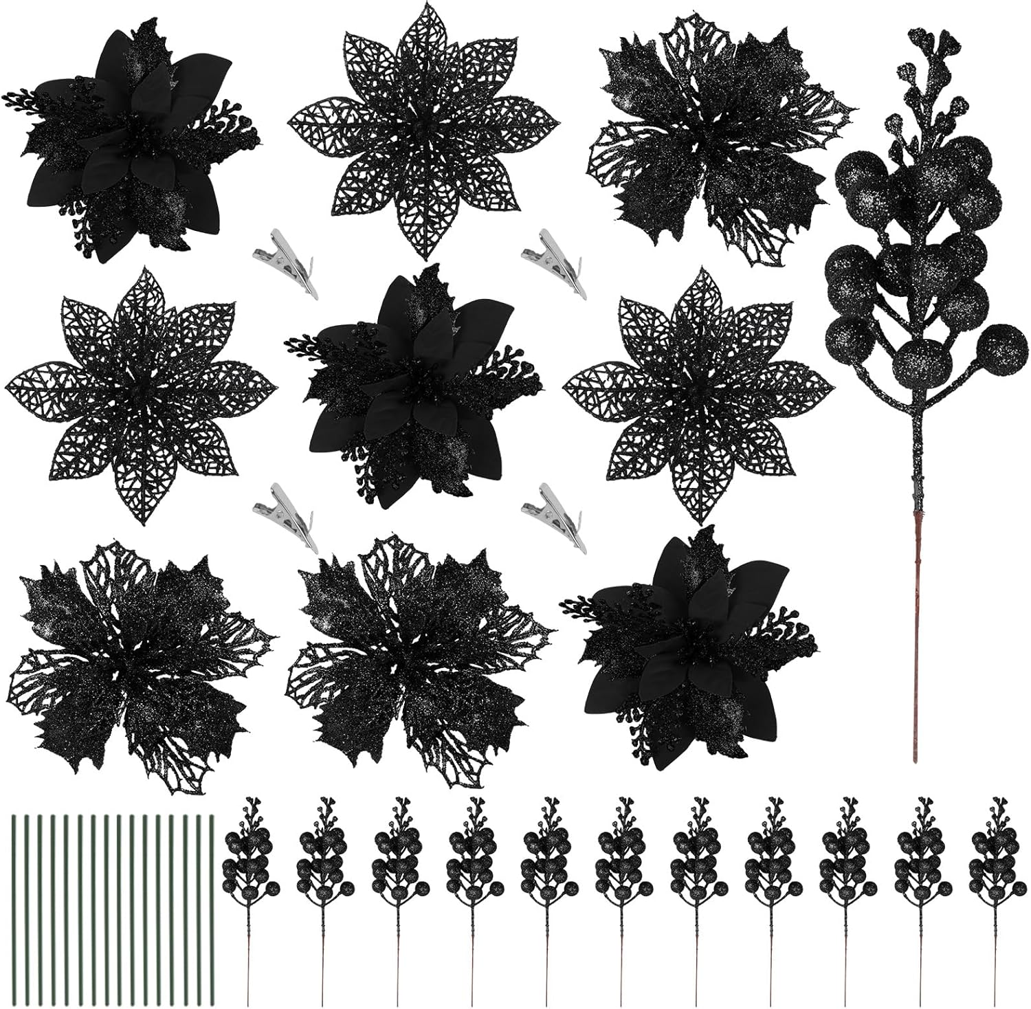 | Additional Features | Glitter Covered, Double-Layered Flowers, Coated Berry Stems |