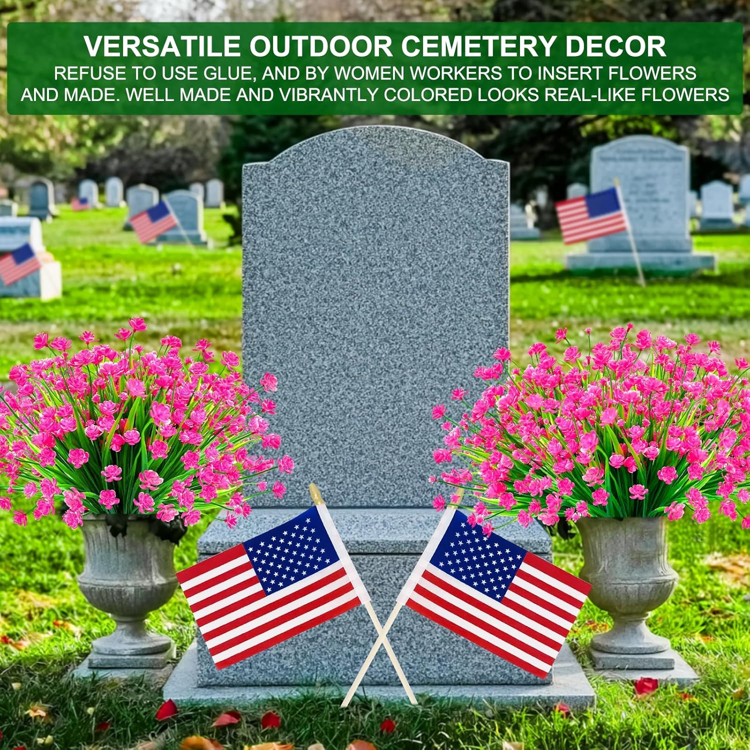 | Recommended Uses For Product | Artificial flowers is suitable for indoor and outdoor spring summer cemetery decorations, all year round, such as home, patios, gardens, offices, porches, yards, hanging planter, balcony, window boxes, corridor, tables, vase, dinning room, bedrooms, kitchens, weddings, funerals, grave, Memorial Day and other places |