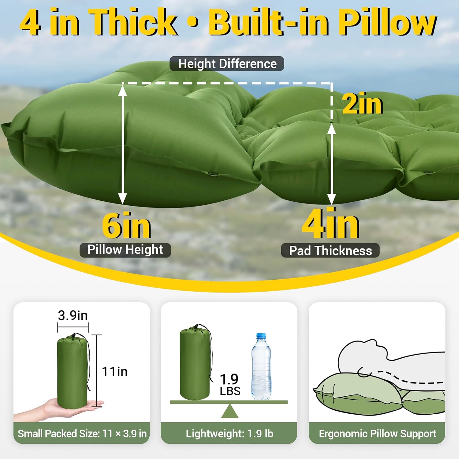 | Key Product Features | 4-inch thick sleeping pad with built-in 6 inch pillow: Thick air cushion helps reduce ground pressure, while the integrated pillow supports your neck for back, side, and stomach sleeping. Adjust firmness and pillow height by adding or releasing air to match your preferred feel—especially helpful for bigger campers who want more lift. Great with a sleeping bag, blanket, and an insulation/foam pad underneath when the ground turns cold., Backpacking sleeping pad with 70D dual-fabric build: Soft, low-rustle 70D polyester pongee top plus 70D reinforced nylon bottom for puncture, abrasion, and water resistance on rocky terrain. Rated up to 500 lb for steady support. Packs to 11 × 3.9 in and weighs 1.9 lb to fit pack side pockets. Includes repair stickers and a carry bag for quick storage between trips., Inflatable camping sleeping pad with built-in foot pump: Step-to-inflate in about 30–60 seconds with no extra pump and no mouth inflation. A quick-release valve enables fast deflation and easy roll-up for efficient pack-up on cold mornings. Not self-inflating; the integrated foot pump makes setup consistent at camp. Pair it with a tent and sleeping bag for weekend trips, thru-hikes, and overnights. The pump area is printed with a footprint icon and simple inflation instructions, so it’s ready to use right out of the bag., Non-slip lightweight sleeping pad with raised side rails for stability: Grippy bottom helps reduce sliding on tent floors, footprints, and even a camping cot, while raised edges help keep you centered when you toss and turn. Unrolled size: 79.1 × 25.6 × 4 in for 1–2 person tents or cots. Snap buttons let you link pads to create a double or multi-pad setup for couples, family, or group camping., Water-resistant backpacking air mattress, easy to clean & giftable: Water-resistant TPU coating help block dampness and reduce ground chill, while maintenance stays simple: wipe with a damp cloth and air dry. Compact, steady, and low-maintenance for hiking overnights, campgrounds, campsites, tent camping, car camping, and travel. A thoughtful gift for backpackers and campers building a sleep kit with tent, sleeping bag, and pad. |