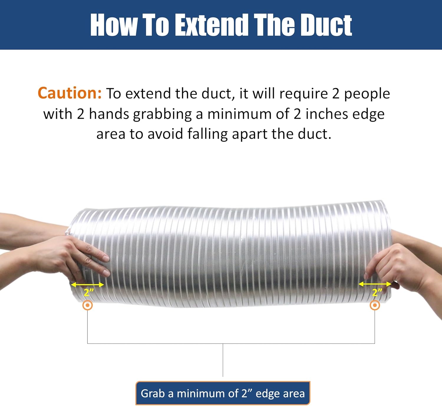 Semi rigid fully flexible plain-ended duct that holds its shape to improve airflow. Made with noncombustible corrugated aluminum continuous lock seams to keep the duct in place which allows for easy installation. Non insulated general purpose venting duct for low & medium operating pressures is ideal for kitchen, bathroom, and range hood venting. Fit 8” top vent range hoods perfectly.It requires 2 people with 2 hands grabbing more edge area to fully expand the duct. Make sure to expand the duct slowly to prevent the duct from pulling apart due to using too much force.Diameter 8 in, Maximum Expanded Length 6 ft. Package includes: 2 Semi-Rigid Aluminum Ducts