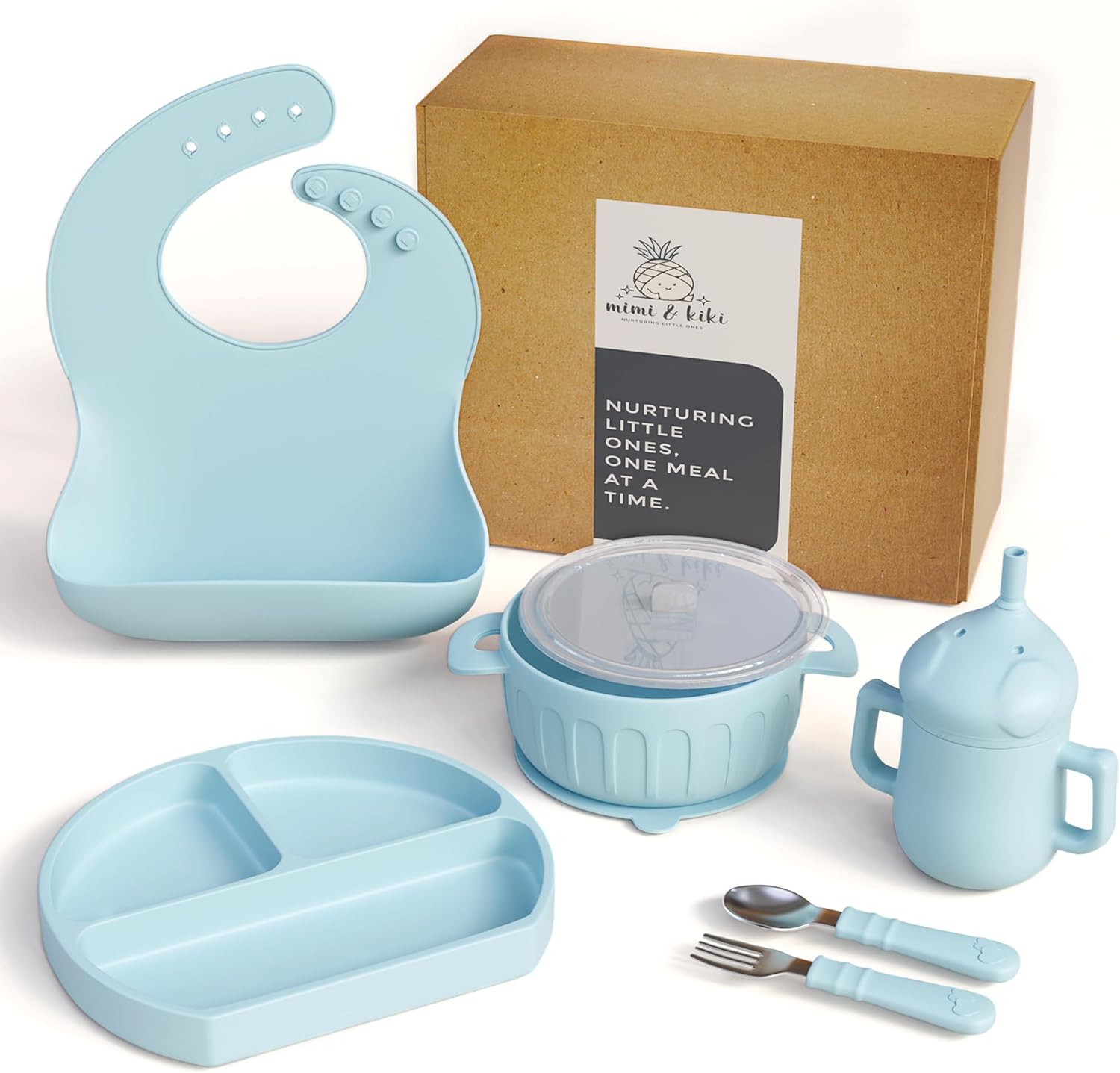 | Included Components | Bib, Bowl with suction and lid, Cup, Plate with suction, Spoon and fork utensils |