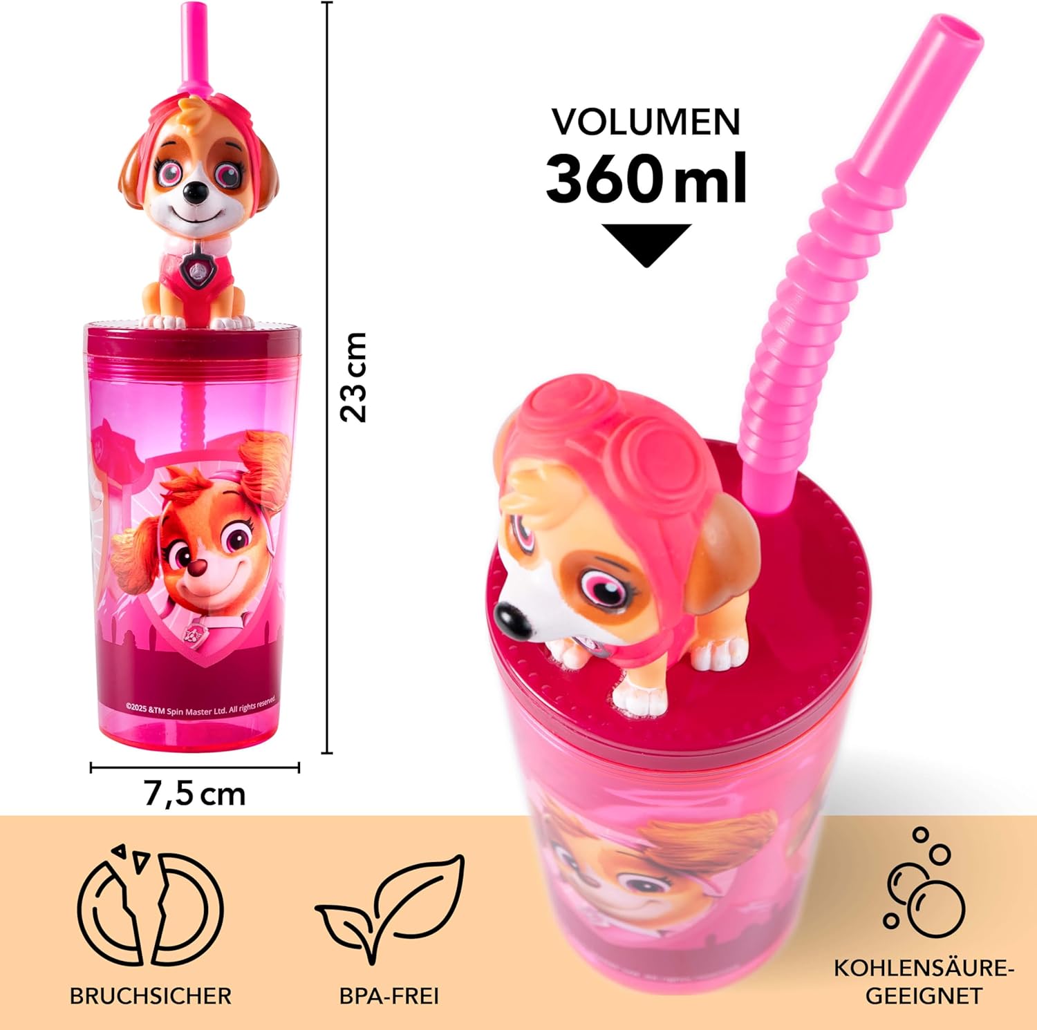 Drink like a heroine - with Skye from Paw Patrol! This lovingly designed drinking cup for children with lid and straw brings colour to every everyday life. The detailed 3D figure from Skye ensures a good mood - at breakfast, in kindergarten or on the go. With a volume of 360 ml, the cup is ideal for small children's hands. The lid reduces spills, the straw stays tight - perfect for active children. The shatterproof, BPA-free plastic makes the cup safe and durable. Also suitable for carbonated drinks - please wash by hand. ️ 3D figure from Skye - a real eye-catcher. ️ 360ml - enough for school & excursions ️ BPA-free and leak-proof. ️ Shatterproof and robust. A great drinking cup for girls - ideal for gifting or for your own Paw Patrol fan at home!