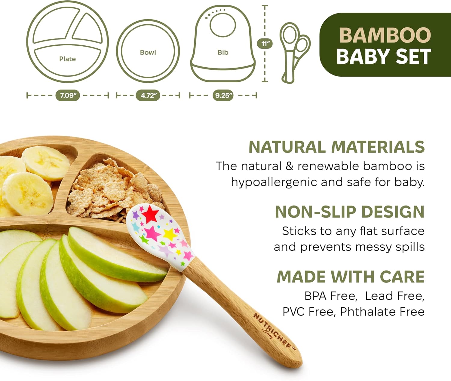Features: Microwave Safe for Silicone Part Up to 392°F, Freezer Safe Up to -104 °F Silicone Baby Bib Suction Bowl and Training Spoons 3 Perfectly Portioned Compartments for Balanced Meals Suction Plates and Bowls for Toddlers Natural Bamboo & Silicone Naturally Hypoallergenic BPA, PVC, Lead, and Phthalate Free Non-Slip and Stay-Put Design Ergonomic Handle Fits Most High-Chairs Easy to Clean Suitable for Children Aged 4-72 Months Food Grade Silicone Tip, Gentle on Tender Gums Shorter and Wider Spoon Easier for the Child to Feed Themselves Adjustable Silicone Baby Feeding Bib Comes with 4 Tightening Buttons What's in the Box: Bowl with Silicone Suction Plate with Silicone Suction (2) Spoon with Silicone Head Silicone Bib Technical Specs: Construction Materials: Natural Bamboo and Silicone Age Recommended: 4 Months to 72 Months Silicone Spoon Dimensions (L x W x H): 5.9' x 0.98'' x 0.43'' -inches Bamboo Plate Dimensions: 7.09'' x 7.09'' -inches Bamboo Bowl Dimensions: 4.72'' x 4.72'' -inches Bib Dimensions: 11'' x 9.25'' x 0.47'' -inches Sold as: 1 Weight: 1.78 lbs.