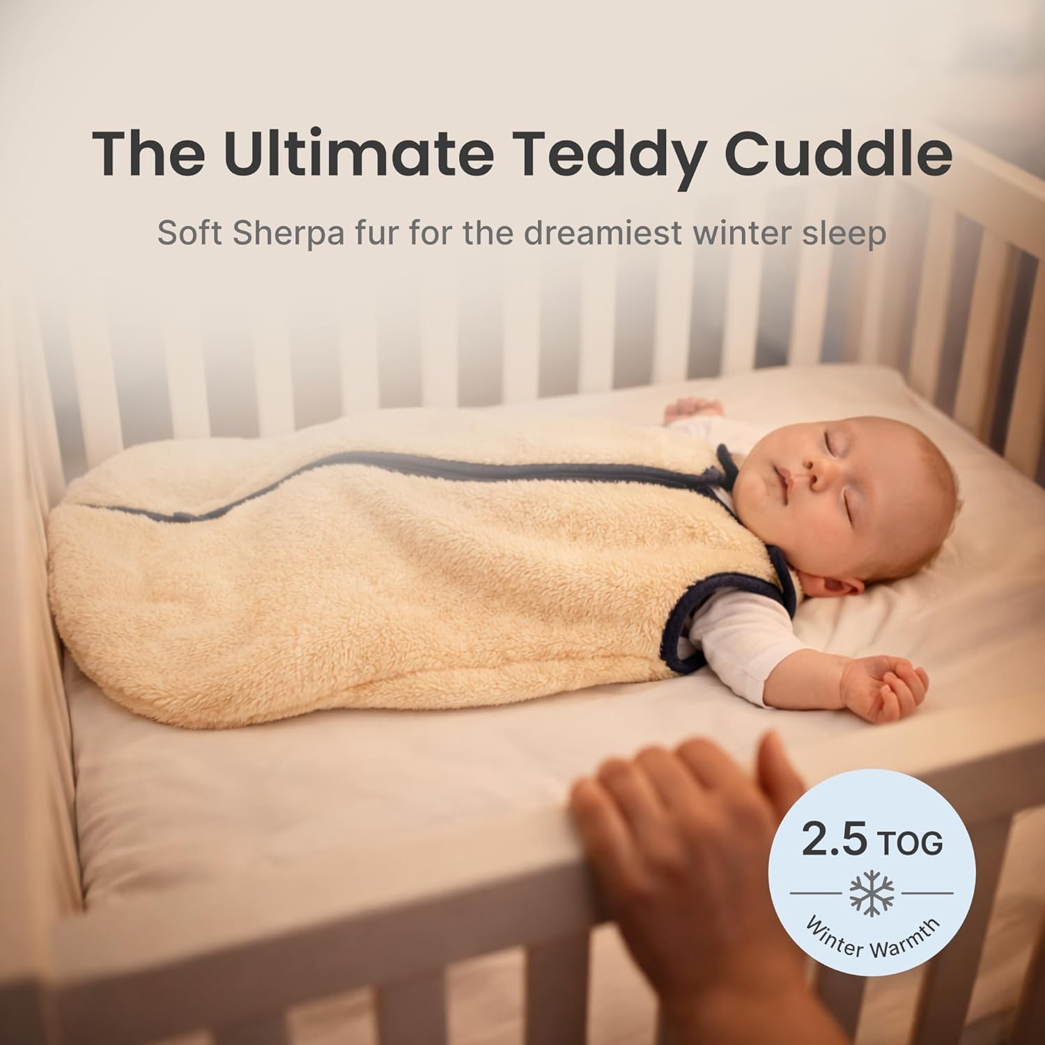 Discover the Baby Deedee Sleep Nest Teddy, the cold-weather sleep essential designed to keep your baby warm on colder nights. Featuring a 2.5 TOG rating, this plush winter baby sleep sack is designed for cooler nursery environments while maintaining breathability for a cozy feel for everyday use. Unlike many newborn sleep sacks that only fit the first few months, our Small size spans 0–6 months, designed to fit early growth stages. The soft Sherpa exterior provides a ultra-soft feel, while the cotton lining helps maintain comfortable warmth. Our patented shoulder snaps make bedtime easier by allowing parents to place a sleeping baby inside without struggling to thread their arms through. Simply lay your baby down, snap the shoulders, and they are ready for bed. For nighttime diaper changes, the reverse bottom zipper allows quick access while keeping your baby's chest warm and covered. Why parents love the Sleep Nest Teddy: Enhanced Winter Warmth – The 2.5 TOG design provides cozy insulation for colder nights while replacing loose blankets. Premium Sherpa & Cotton Comfort – A plush Sherpa exterior paired with breathable cotton lining creates a comfortable feel for everyday use. Sleeveless Design – The wearable blanket design prevents kicked-off covers while allowing natural movement. Easy Care Durability – Machine washable construction maintains its soft “Teddy” loft even after repeated washes. Sizes for Growing Babies – Available in 0–6, 6–18, and 18–36 month sizes to support your baby through multiple growth stages. Whether you're preparing for winter nights or adding a cozy essential to your baby registry, the Baby Deedee Sleep Nest Teddy delivers warmth, comfort, and peace of mind for parents and babies alike.