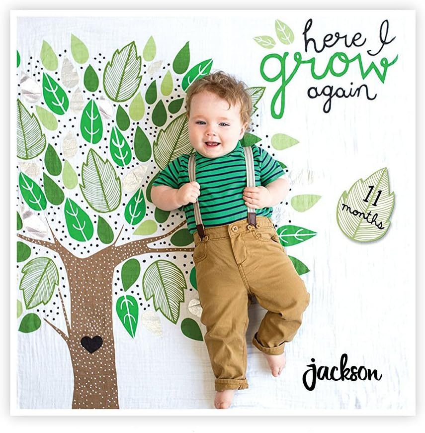 Personalize this adorable Baby's First Year Growing Tree with Leaves Blanket and Milestone Cards Set with your child or loved one's name in vinyl! Beautifully detailed with printed tree background and the phrase 'here I grow again' printed on the blanket, along with green leaves, silver leaves and polka dots. Blanket is made from 100% cotton muslin and is multi-functional for use as swaddle, nursing cover and more! Purchase includes cards with 18 colorful milestones shaped as leaves that make great photo props. This deluxe blanket set includes holiday milestone cards of Valentine's Day, Easter, Thanksgiving and Christmas. Measurements for the blanket are approximately 40" x 40". Note: Items that are customized specifically for the customer (such as monograms, names, embroidery, etc.) are not eligible for a return. Please refer to the "Customized Products" section of the Amazon Return Policy for more info and double-check all spelling prior to submitting your order.