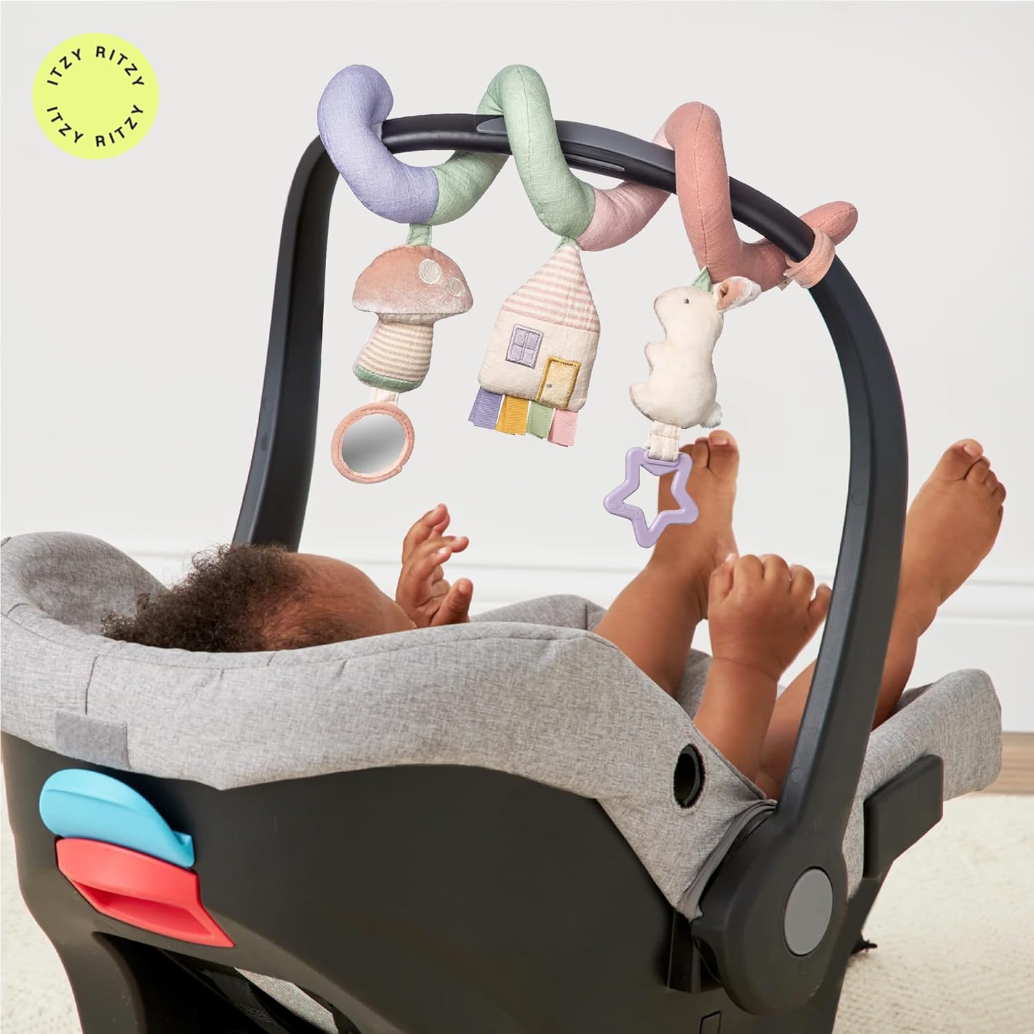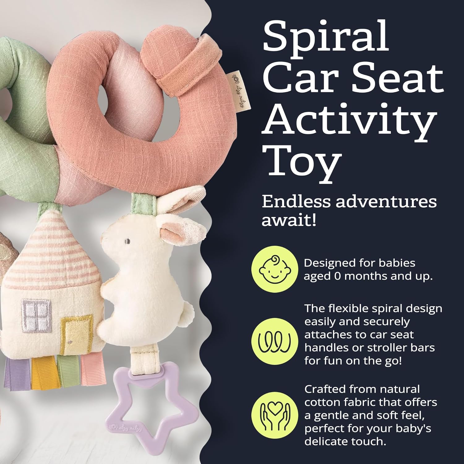 Travels abound! Endless adventures await with your babe’s new travel tagalong, the Itzy Bitzy Spiral from our Bitzy Bespoke collection! Watch as your babe reaches for the dangling ring, smiles at their reflection in the hanging mirror, and grasps for the ribbons keeping their little hands busy. Our natural cotton fabrics are gentle & soft to baby’s touch. For the many travels ahead, easily attach the Itzy Bitzy Spiral to car seats and strollers for fun on the go! Whether it's a quick stroll or a long car ride, this travel tagalong promises endless entertainment for your little explorer. Immerse your baby in a world of sensory delight. The carefully curated design of the Itzy Bitzy Spiral encourages tactile exploration, visual engagement, and auditory stimulation, fostering crucial developmental milestones. The combination of the soft, textured fabrics and interactive elements makes this tagalong not just a source of entertainment but a valuable tool for your baby's growth and discovery. Elevate every journey with the perfect blend of fun and learning!