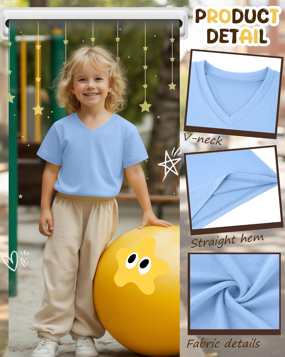 Design: Dress your little girl in this stylish and comfortable V-neck T-shirt, ideal for daily wear! Designed for toddlers aged 18 months to 5 years, this shirt offers a relaxed fit that ensures plenty of freedom for play and movement. Whether they're heading to school, a play date, or a daily casual, this T-shirt is a basic item in their wardrobe The toddler tees combine comfort, style, and practicality. Suitable for various occasions, it's easy to match and create a fresh and cute look Care Tips: The kid's t-shirt is machine washable or hand washable and will maintain its shape even after multiple washes, without easily deforming or fading >Material: 60% Polyester, 35% Cotton, 5% Spandex Quantity: 3 Pcs Season: Spring, Summer Remarks: Manual measurement, please allow slight errors in size Colors may vary slightly due to different screen displays