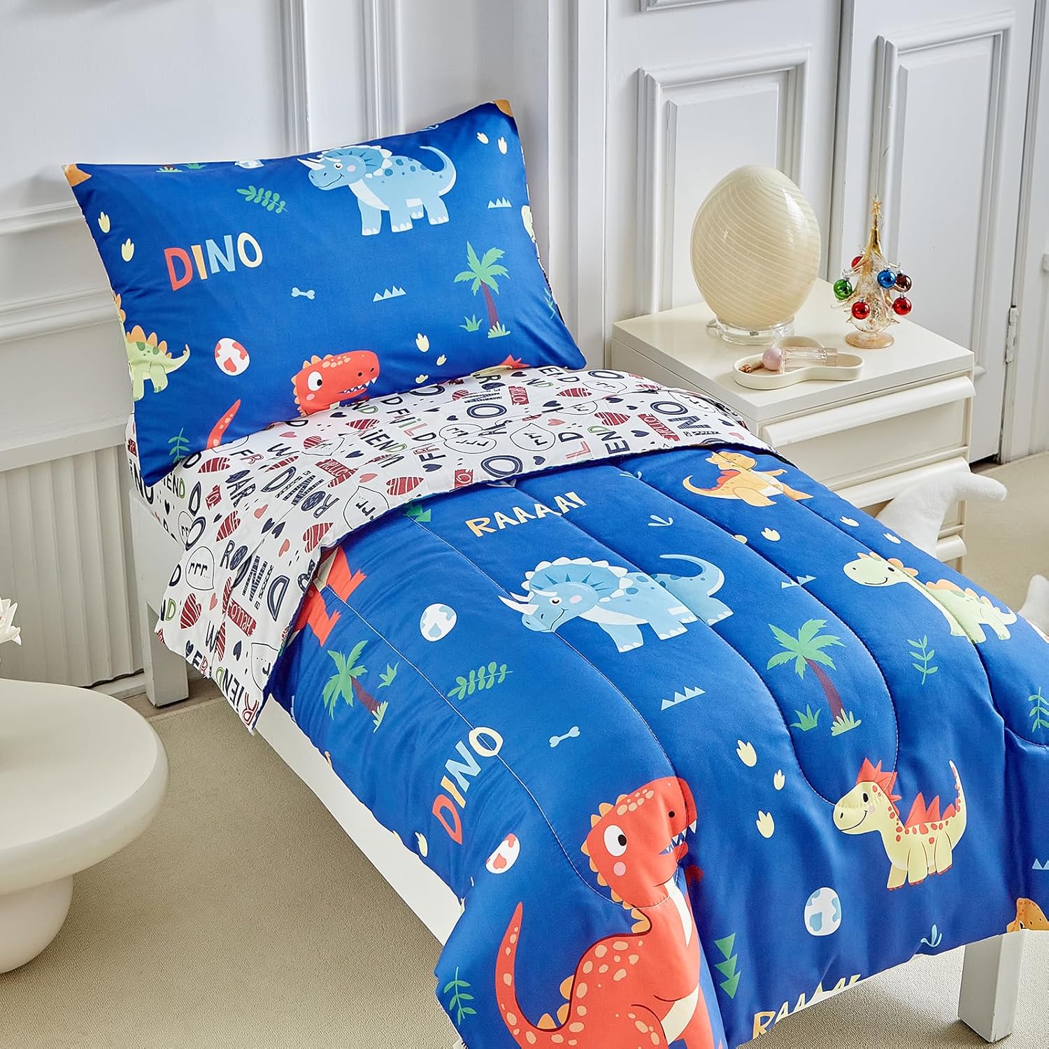 Dinosaur Toddler Bedding Set for Boys Girls 4 Pieces Toddler Bed Set - Ultra Soft Cartoon Cute Orange Yellow Blue Green Dinos - Comforter Fitted Sheet Flat Sheet Pillowcase Navy