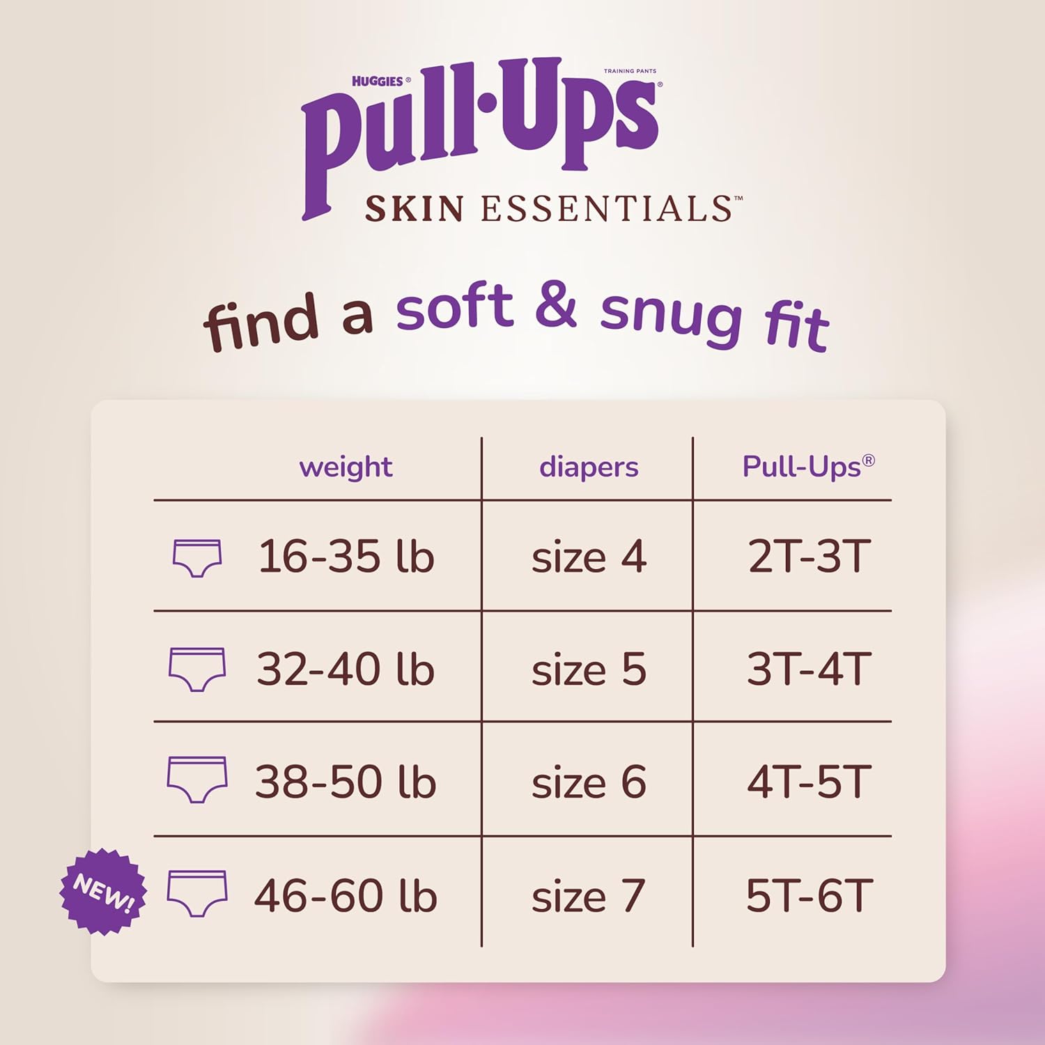 Put your child’s skin health first during the potty training process with Pull-Ups Skin Essentials Training Pants for Girls. Each training underwear is designed with ultra soft and breathable materials that help to keep your child comfortable and help protect their sensitive skin. Up to 100% leak free, Pull-Ups Skin Essentials Potty Training Pants feature a targeted absorbency zone to protect girls where they need it most and help maintain comfortable and healthy skin. Dermatologist-approved Pull-Ups Skin Essentials toddler training pants for girls are hypoallergenic, free of fragrance, elemental chlorine, parabens, phthalates, natural rubber latex and lotions. For little ones who are on-the go, these training pants feature soft, refastenable sides that allow for easy changing. Our girls training pant feature designs from Disney’s Frozen with snowflake graphics that fade when wet to help motivate your child to stay dry. Pull Ups Skin Essentials training pants and Huggies Skin Essentials diapers and wipes give you everything you want for your child’s skin and nothing you don’t. They’re dermatologist-approved and designed to help keep skin clean and healthy from baby to Big Kid. When your child is ready to begin her potty-training journey, the Pull-Ups brand can help. Visit the Pull-Ups website for potty-training tips and resources. Pull-Ups Girls' Training Underwear are available in sizes 2T-3T (16-34 lbs), 3T-4T (32-40 lbs), 4T-5T (38-50 lbs) and 5T-6T (50+ lbs).