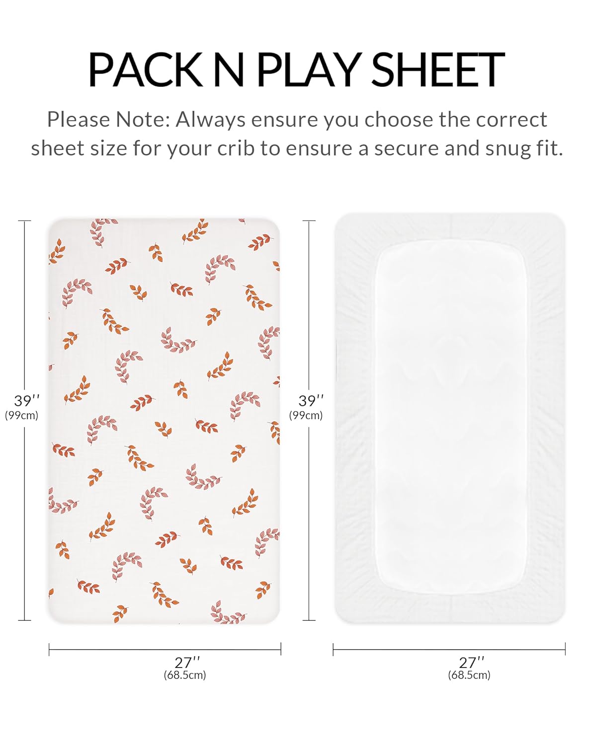Muslin Cotton: Our pack n play sheet is made of muslin cotton, with a smooth surface and comfortable touch, features a light drapability and rigidity, suitable for your baby's delicate skin, and let your little one have a better sleep. 39"x27"x3": The pack and play sheets are designed to fit Pack and Play Mattress and Mini Cribs, making them easy to use and compatible with most Pack and Play Mattress and Mini Cribs. Easy to Clean and Maintain: The playard sheets are machine washable and dryable, making them easy to clean and maintain. This is a great convenience for busy parents, and helps to keep the sheets looking and smelling fresh. Versatile Style: Available in a range of colors to complement any nursery decor. Good Gift Option: It can be a thoughtful and practical gift for new parents or parents-to-be that can provide a safe and comfortable place for a baby to sleep.