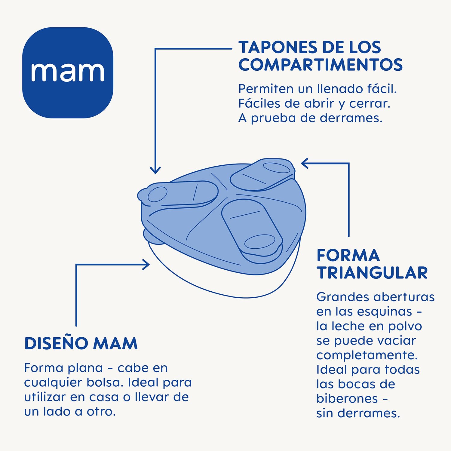 Milk Powder Dispenser Its triangular design and wide corner openings allow for easy filling of the bottle and prevent spills. With its size and flat shape, this dispenser is ideal for taking with you wherever you go. Features three compartments. In addition to storing milk powder, it is also suitable for storing snacks, pacifiers and teats. Each compartment holds up to 40g. This dispenser is sterilizable and dishwasher safe. This product is made with BPA and BPS free materials.
